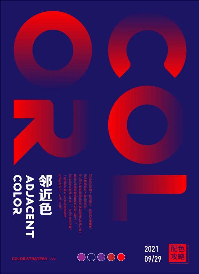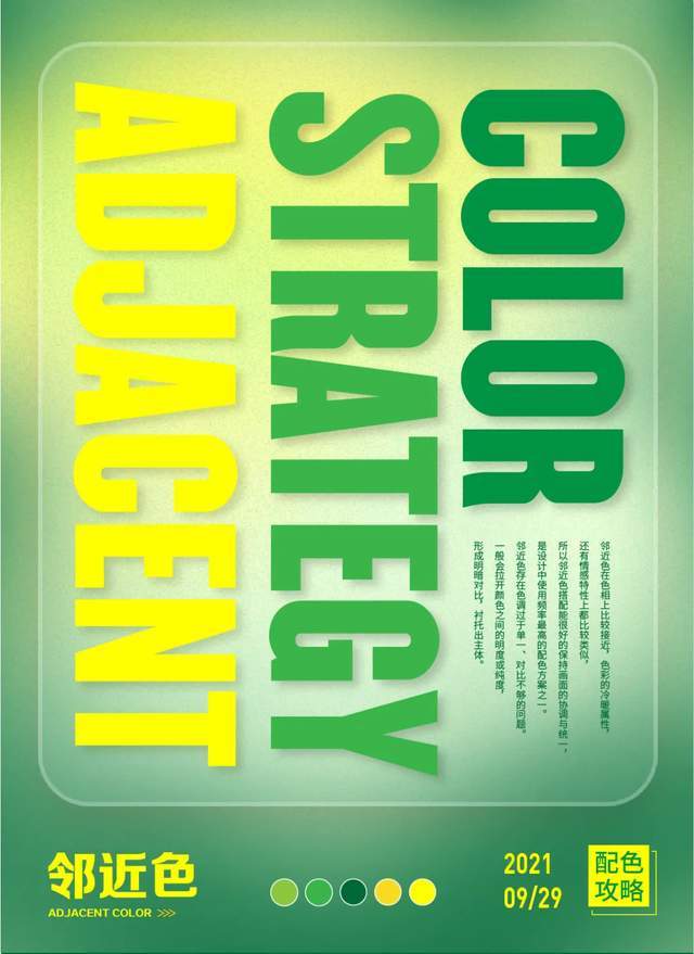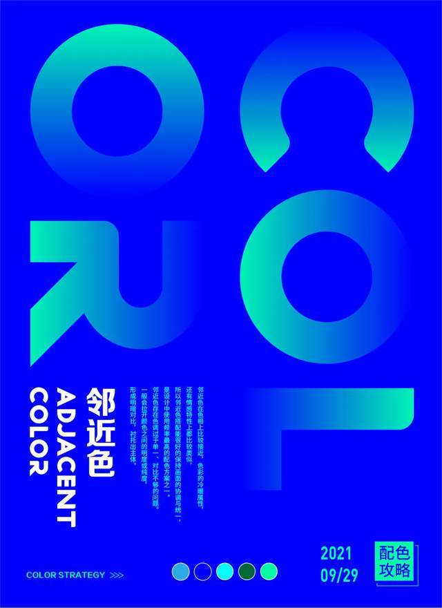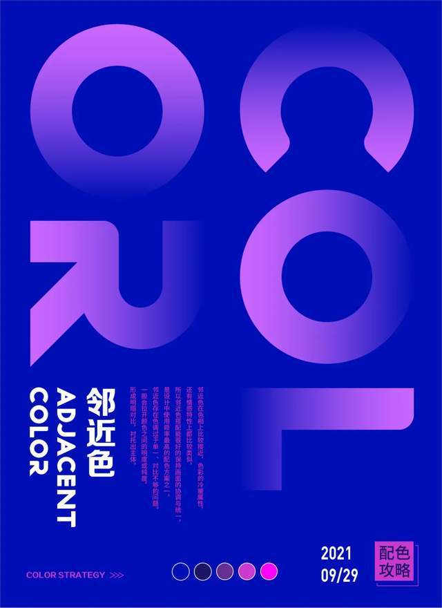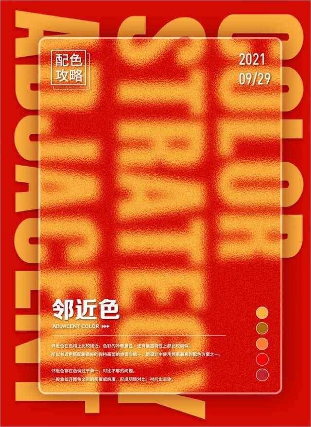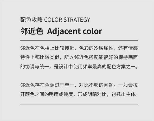 由于邻近色在色相上比较相近,色彩的情感特性、冷暖属性都比较类似,所以,邻近色的搭配能够很好地保持画面的协调和统一,是我们在设计中比较常会使用到的配色方案之一。