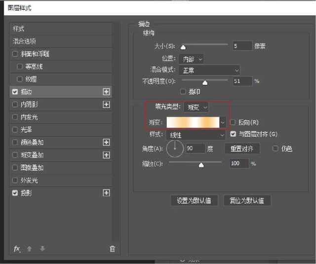 画出白色的圆角矩形,为矩形添加图层样式“描边”、“投影”。描边填充类型我们选择为“渐变”,颜色选择浅橙与白色的渐变,模拟玻璃边缘的厚度。