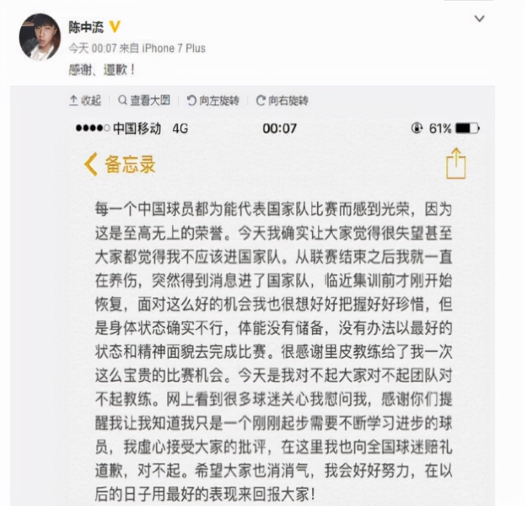 眼看舆论压力越来越大,陈中流发了一条道歉微博。文字里提到:自己是带伤出战,所以跑不起来。乍看上去,陈中流的解释合情合理。然而,愤怒的球迷却不买账。正如不少人所说的:合着是把锅甩给里皮了呗,是他非要让你带伤踢比赛。不用想也知道,这则微博不仅没平息众怒,反而成了火上浇油。