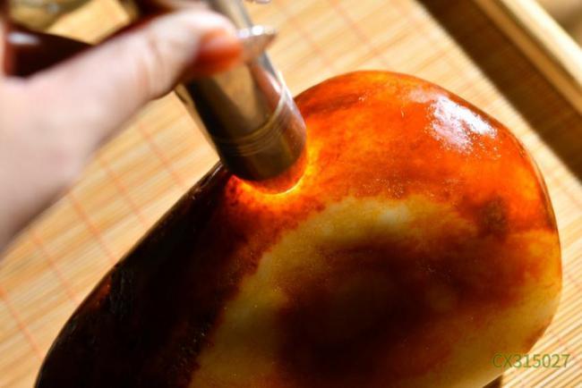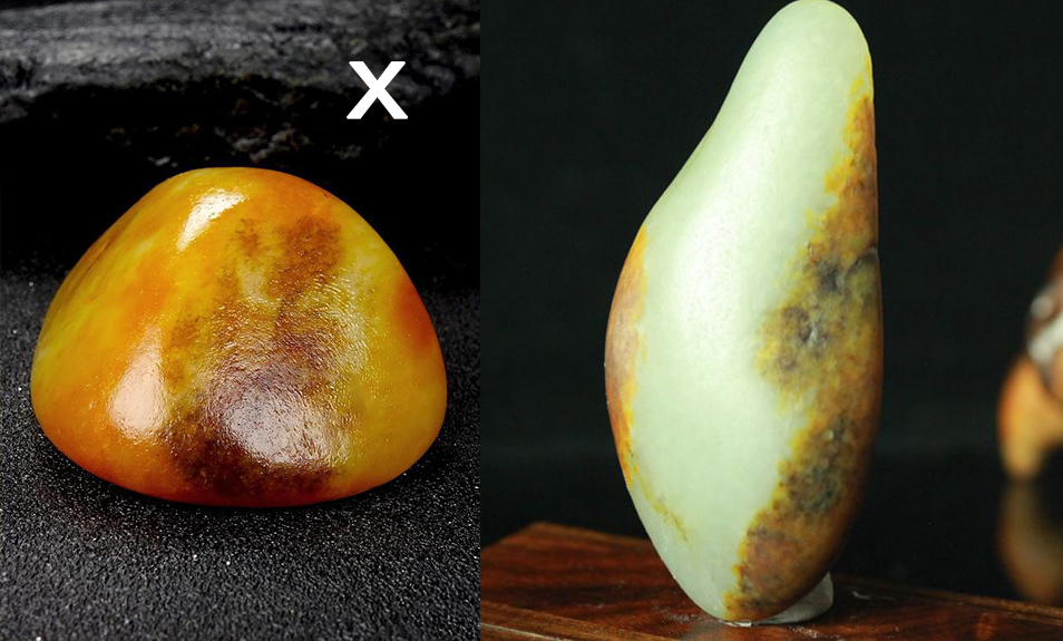曾经有一段时间和田玉籽料的皮色被疯狂的追捧,认为颜色越艳丽,价值就越高,在这样畸形的审美之下,有部分商家就开始铤而走险,开始给籽料进行二次染色。