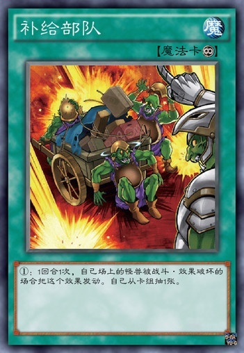 卡图描绘了哥布林精英部队呵斥因铺天盖地的攻击而不敢运送补给品的哥布林突击部队的场景。英文版卡名字译为Supply Squad。