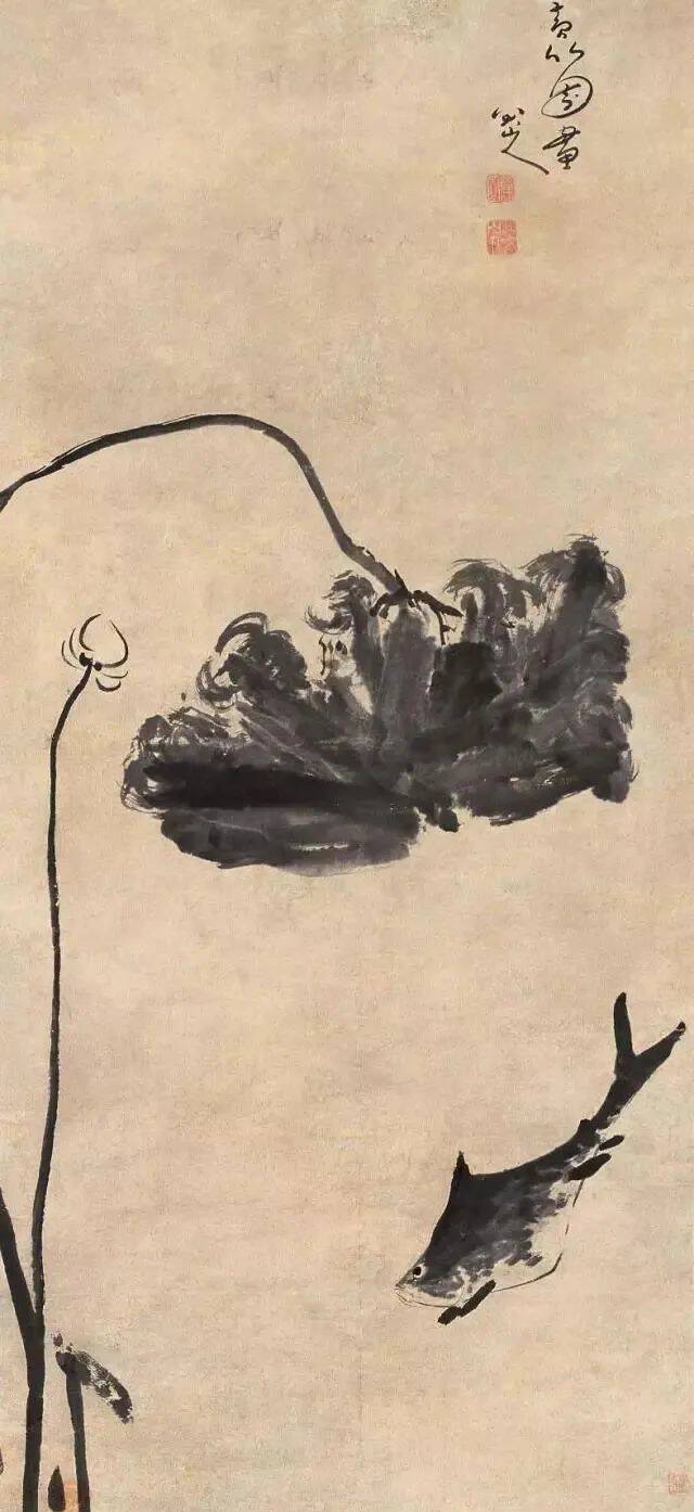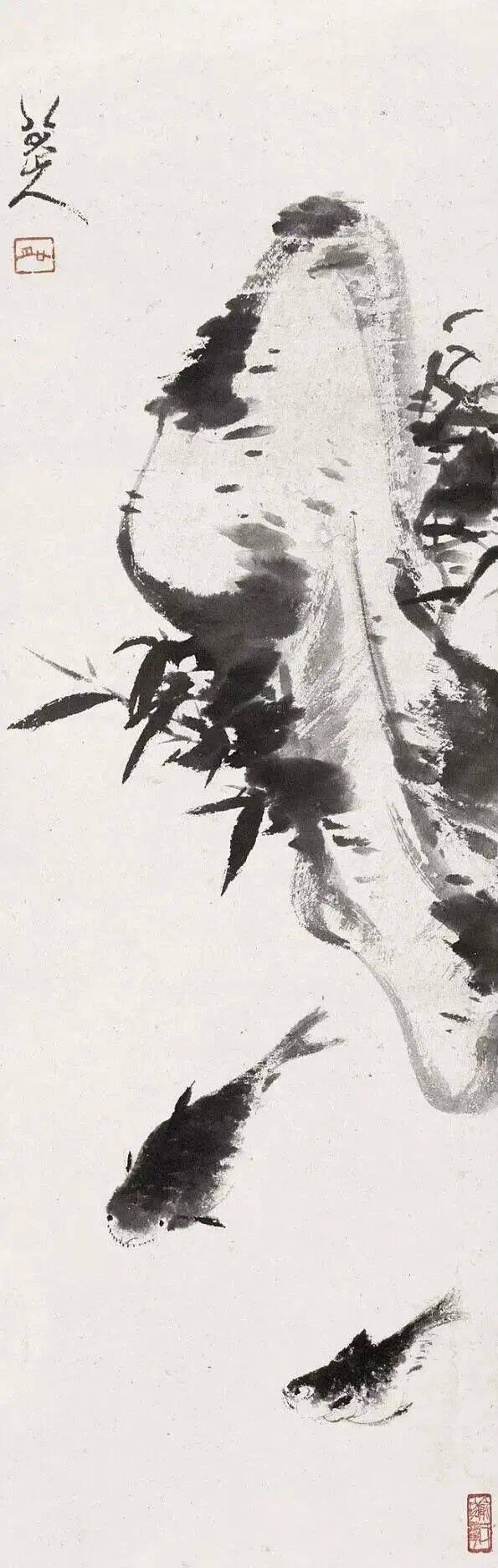 画鱼有时要配搭岩石、花草,来增加画面的美点和曲折,总是以简洁为主,也不宜设色,水墨的反觉得淡雅有致。