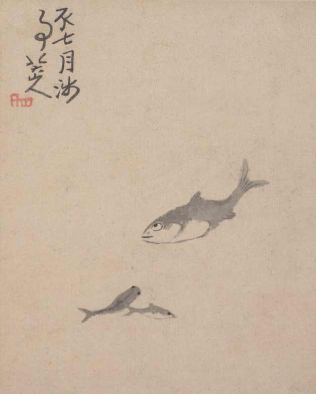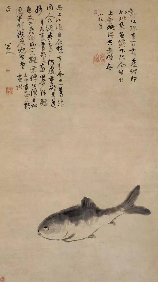 但是我最佩服的还是八大山人。他画鱼的方法,能用极简单的构图与用笔,就能充分的表现出来,真有与鱼同化的妙处。