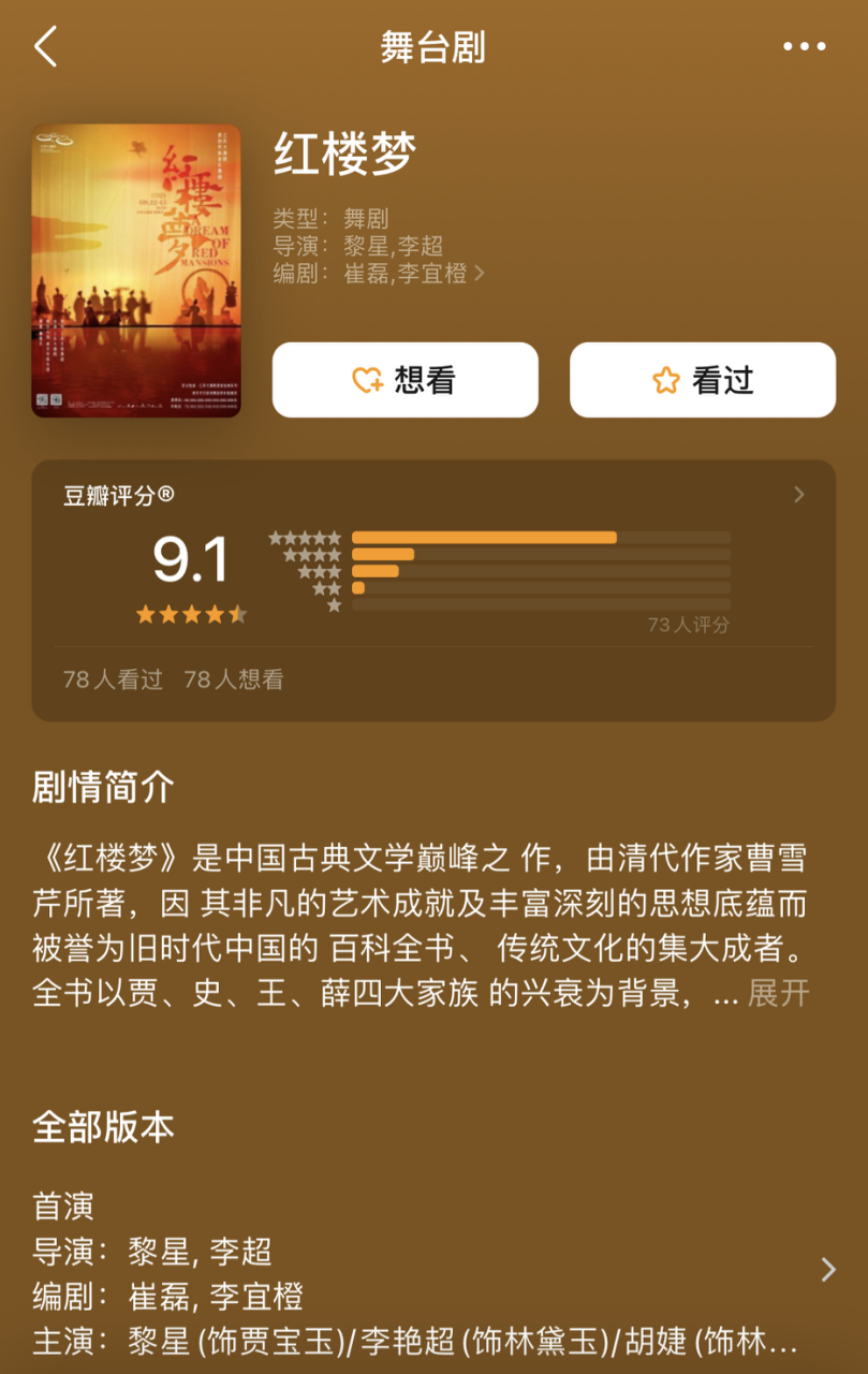 年度大戏舞剧《红楼梦》在完成首演后,受到了广大网友、剧评人大力推荐,在豆瓣喜提9.1的好成绩。