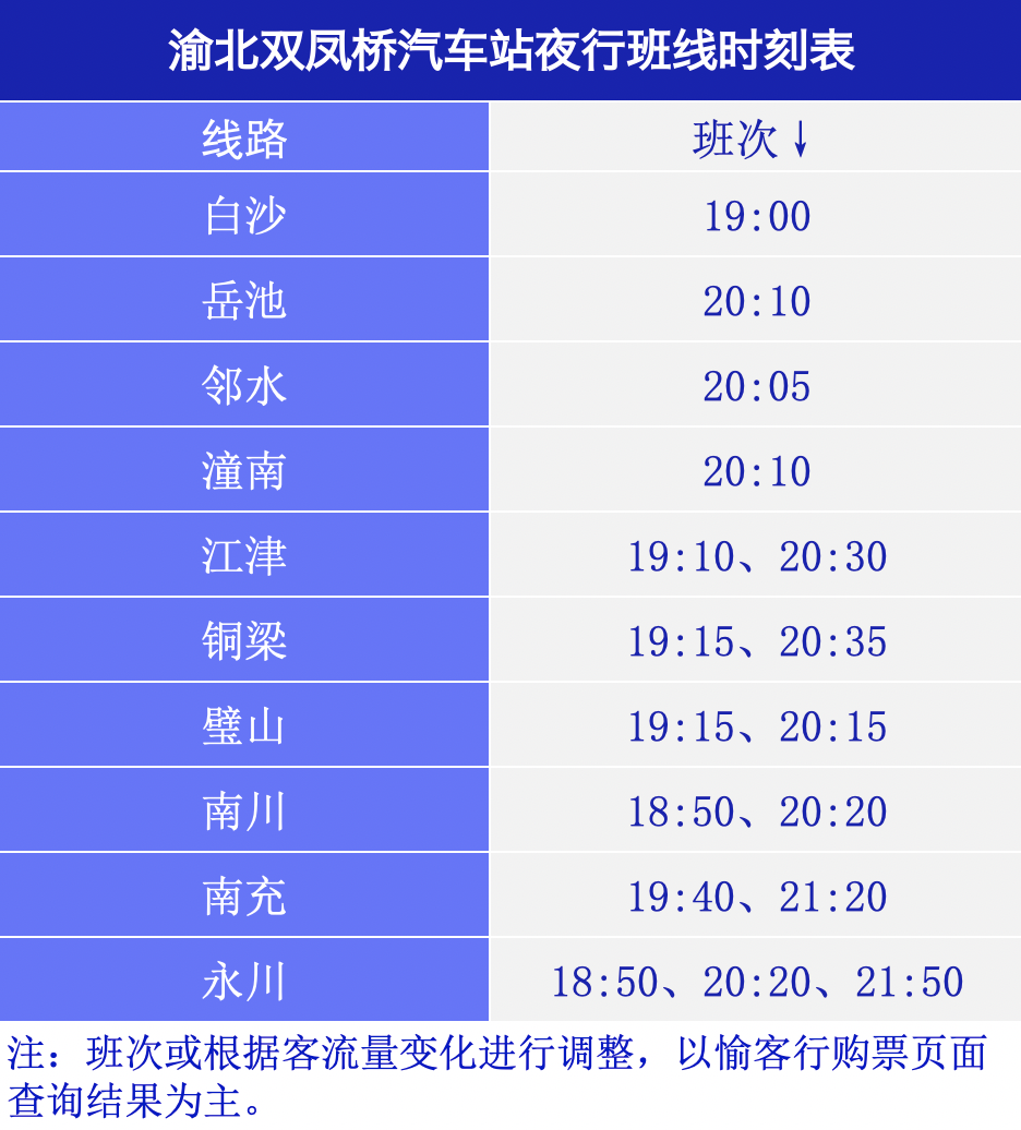 为进一步丰富多时段运营线路,满足广大旅客朋友出行需求,渝北双凤桥汽车站自10月15日起,新增重庆主城至白沙、岳池的夜行班车。至此,双凤桥汽车站已有10条夜行班线,方便旅客朋友们在下午较晚时间也能乘车往返市内外多地。