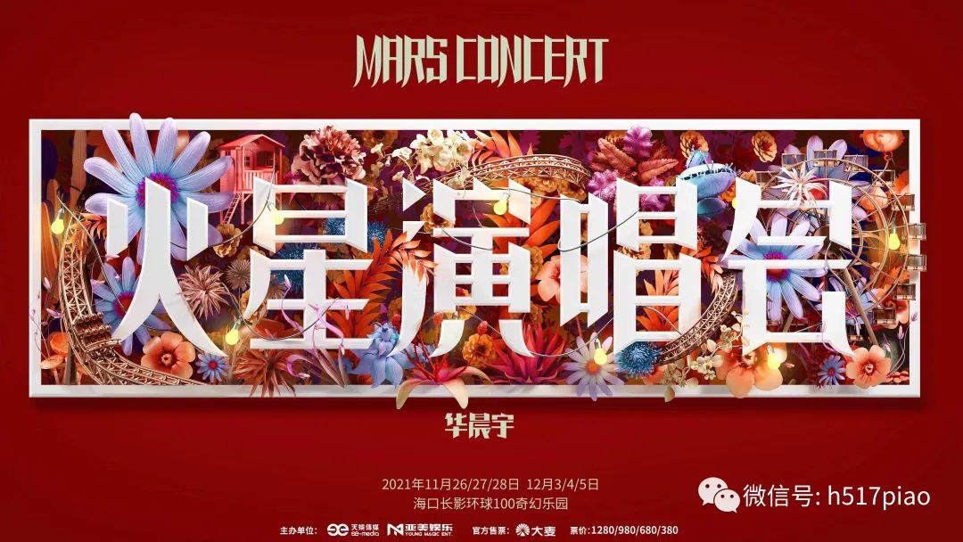 筹备近三年,“2021华晨宇火星演唱会”将于11月26日——28日、12月03日——05日在海口长影环球100奇幻乐园火热开唱。本次演唱会着力实现华晨宇“大家坐在一起聊聊天、吃吃东西”的初心设想,力求打造集演出、娱乐、吃喝游玩于一体的全新乐园体验,让歌迷以爱之名欢聚“火星城”,开启一段沉浸式治愈之旅。演唱会概念海报主体色调沿用以往的“火星红”,犹如一份召唤火星人归家的摩斯密码,联结起华晨宇和歌迷们尘封已久却心照不宣的默契,海报背景元素以热烈花海为主,呼应“春暖花开见”的约定,并汇集霓虹灯、过山车、钢琴、树屋、摩天轮等多重美好元素,增强情节性,提升梦幻质感。