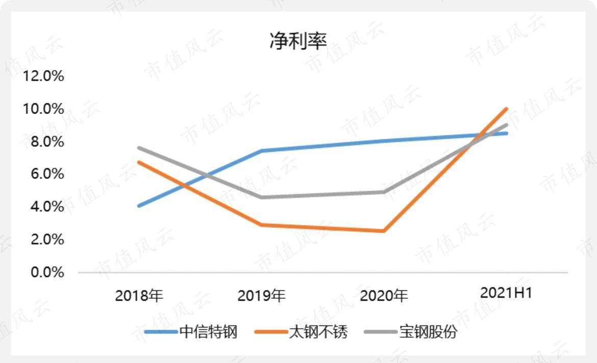 不同于两家可比公司净利率大幅上升,中信特钢的净利率仅较2020年略有升高。