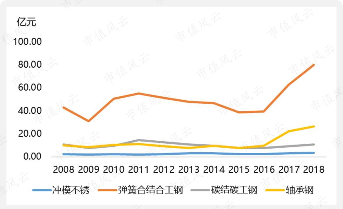 分产品来看,弹簧合结合工钢和轴承钢是大冶特钢营收增长的主要原因,但这两项产品营收增长主要发生在2017和2018年。
