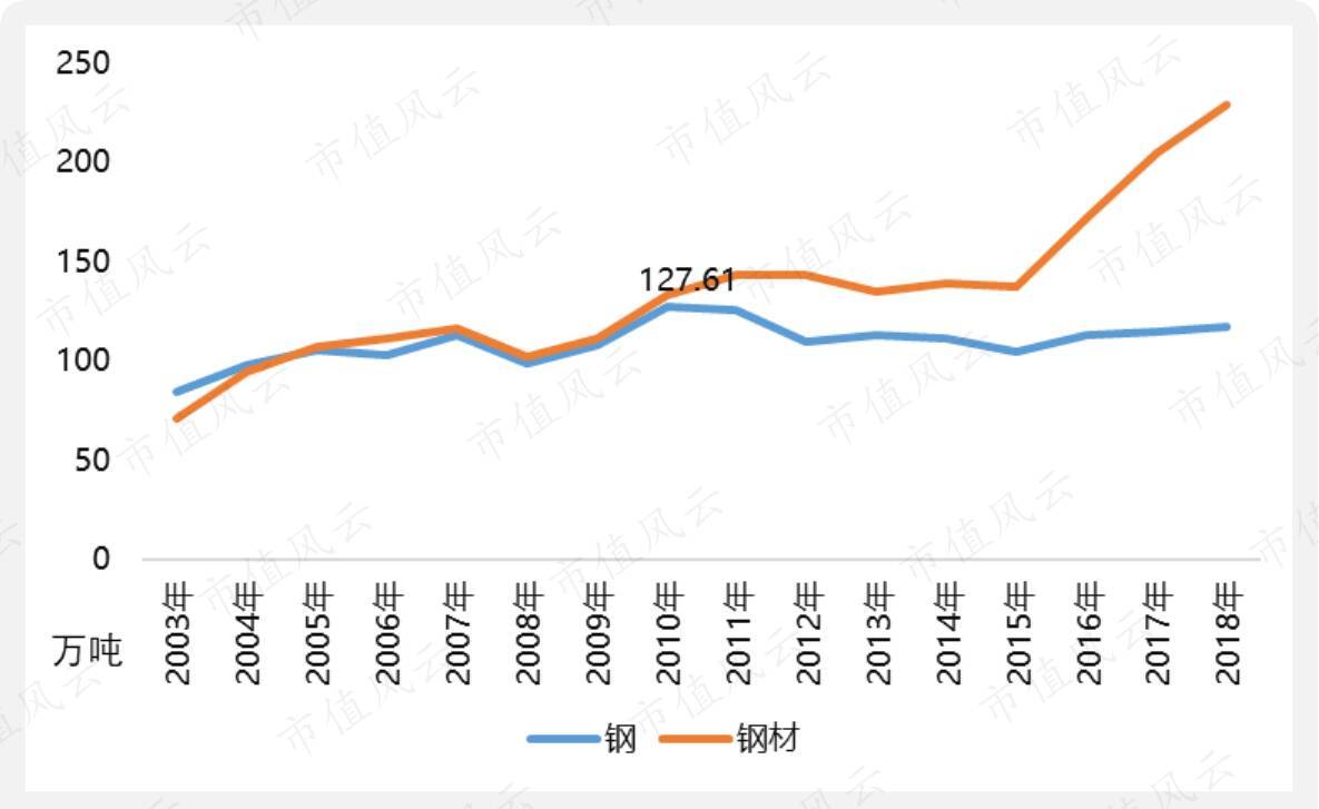 最直观的改变是,自2005年开始,大冶特钢的钢材生产量超过了钢产量,钢产量没有明显变动的情况下,钢材产量逐年上升。