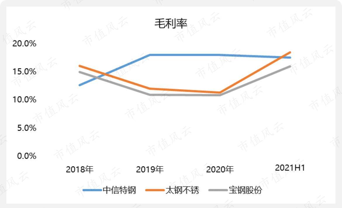 2021年上半年,宝钢股份和太钢不锈均在年报中表示随着下游钢材市场供需两旺,业绩大幅提升,毛利率显著改善,太钢不锈的毛利率已经超过中信特钢。