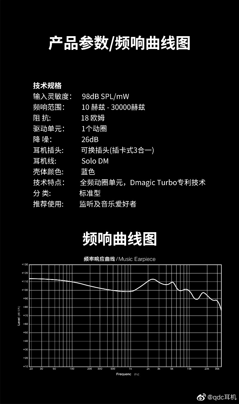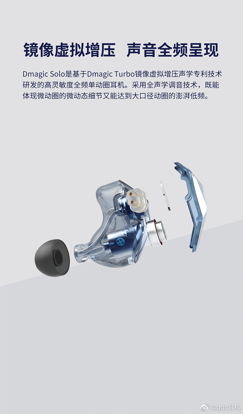 Dmagic Solo 搭载全频单动圈单元,基于 Dmagic Turbo 镜像虚拟增压声学专利技术研发,采用全声学调音技术,能够在小直径微动圈单元上实现大口径动圈耳机特有的澎湃低频。