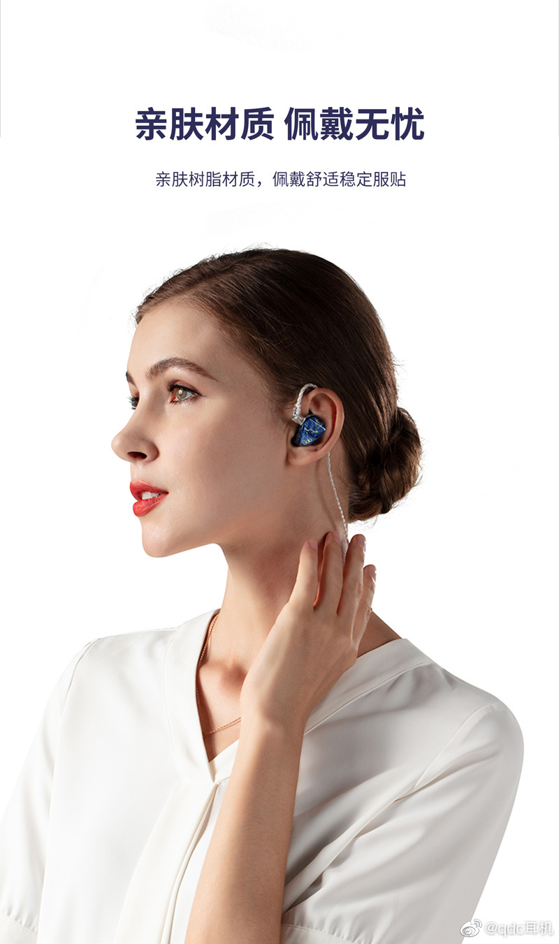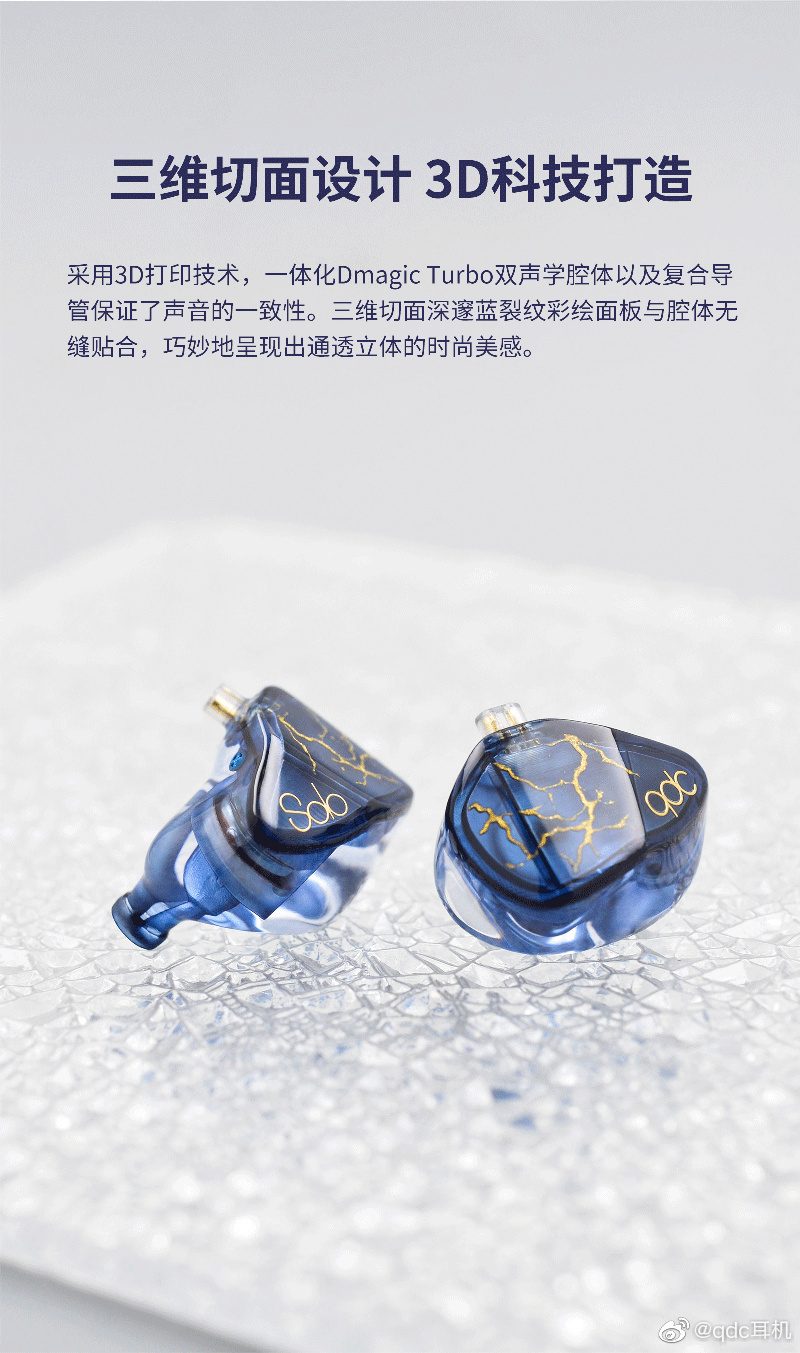 耳机采用 3D 打印的透明外壳,内部的动圈单元与一体化 Dmagic Turbo 双声学腔体结合在一起。腔体通过复合声学导管与耳机导管出口相连。耳机使用 QDC 特有的 0.78mm 凸起双针插口,可以换线。