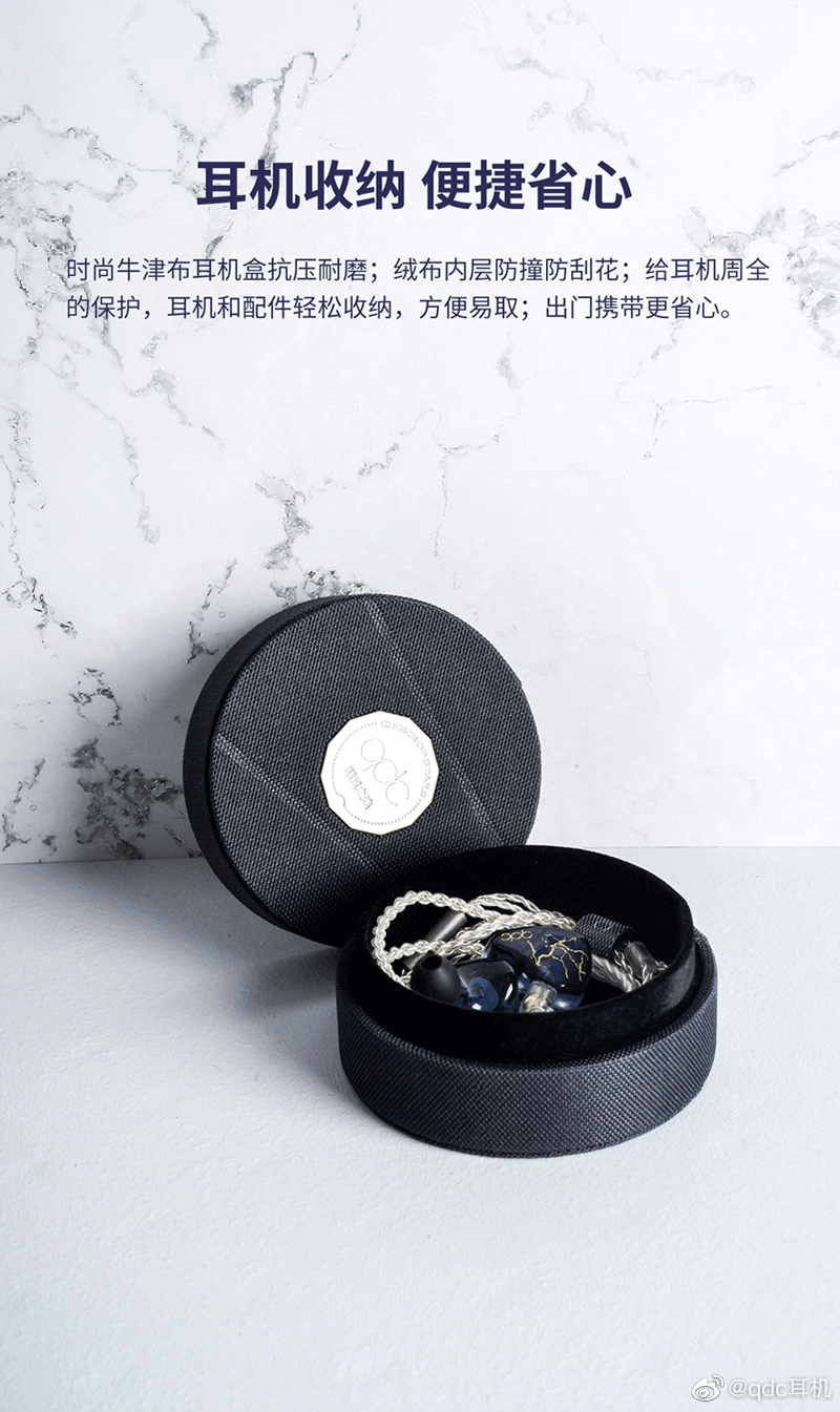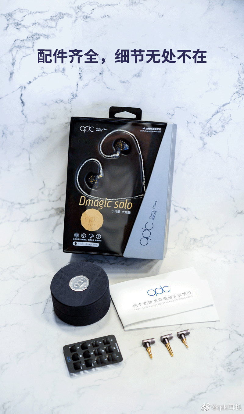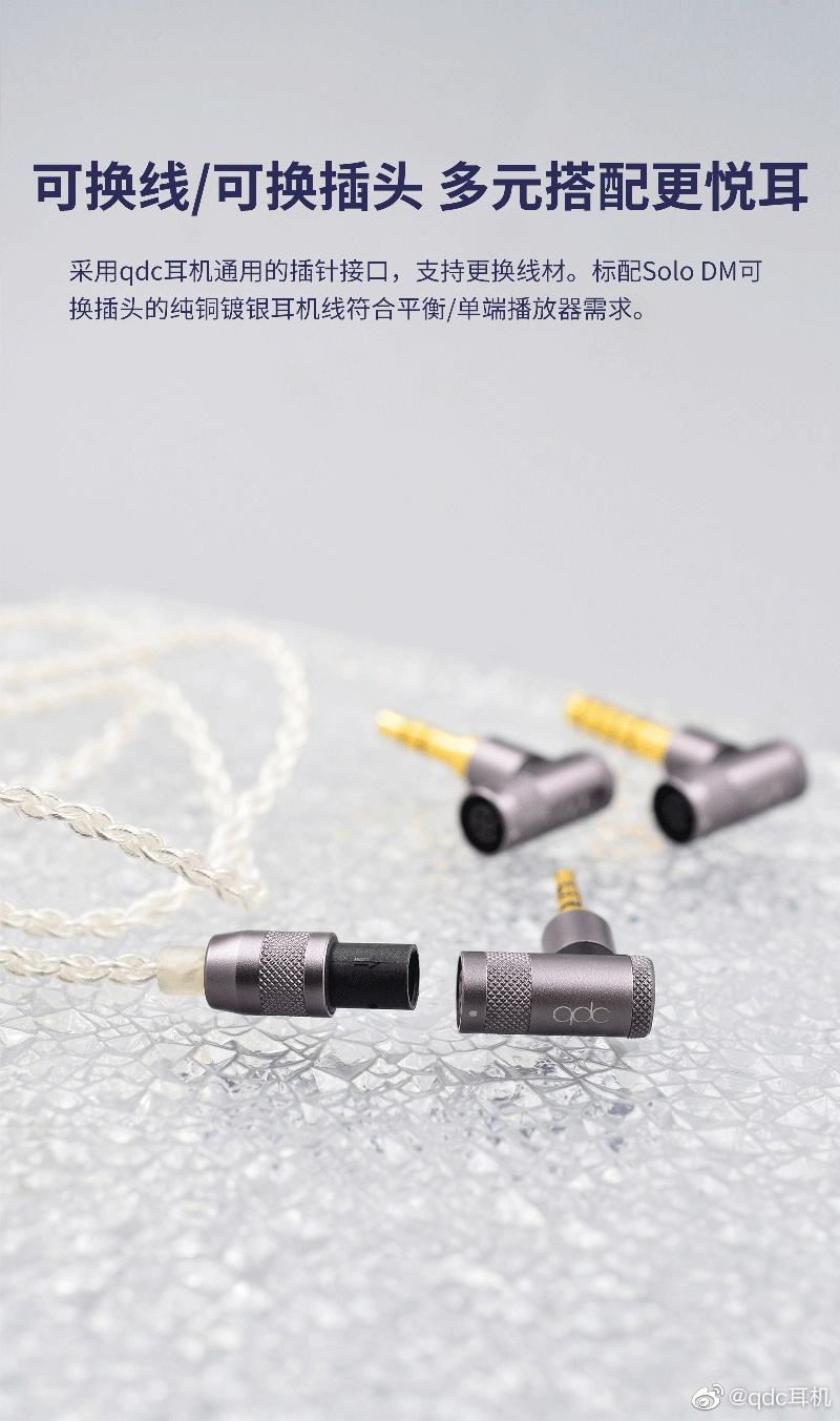 IT之家了解到,qdc 此款耳机标配 Solo DC 可换插头纯铜镀银耳机线,提供三种接口。此外,还附带牛津布耳机盒、双节套等配件。该产品目前已经正式开启预售,将于近期发货