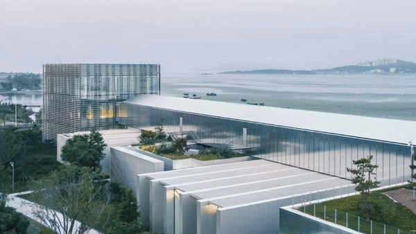 外部造型犹如一艘大船的主体建筑17000平米,内部有12间形态各异的展厅,相互连通又相对独立,临海而建。