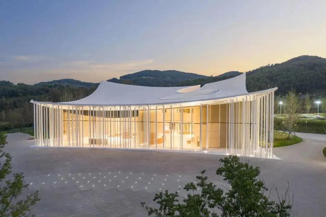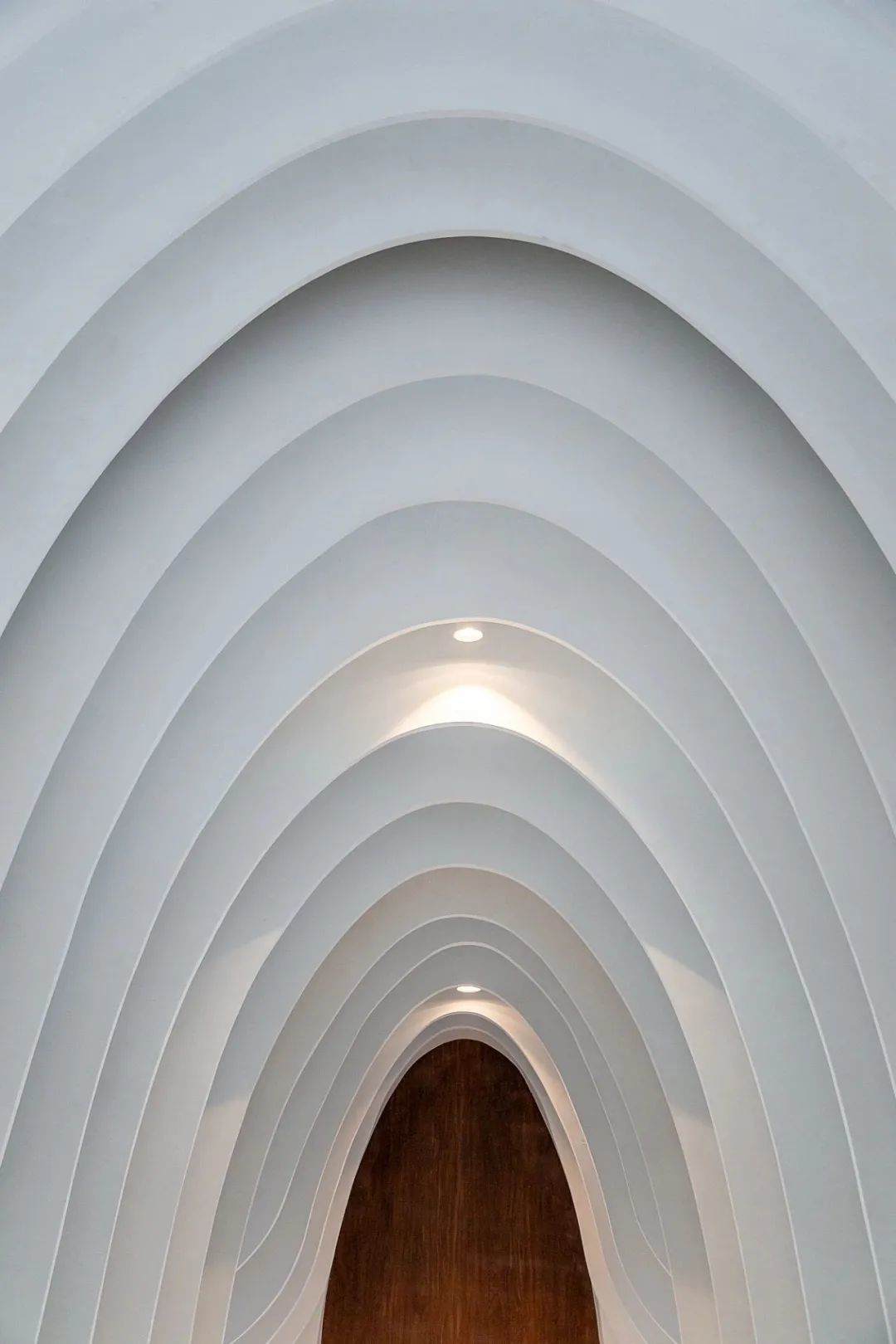 礼堂内部柔和曲线随序列放缩,腔体造型似母亲子宫,如流水般线条层层叠加,营造出时空流动的轻盈感。