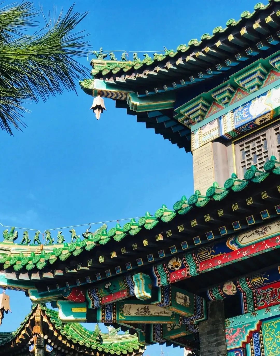 除戏楼为琉璃瓦盖顶,其它建筑物均为清水墙、小灰瓦,且经苏州式彩绘点染,雕梁画栋,金碧辉煌。