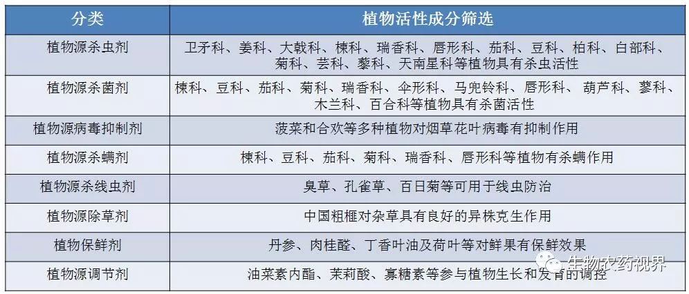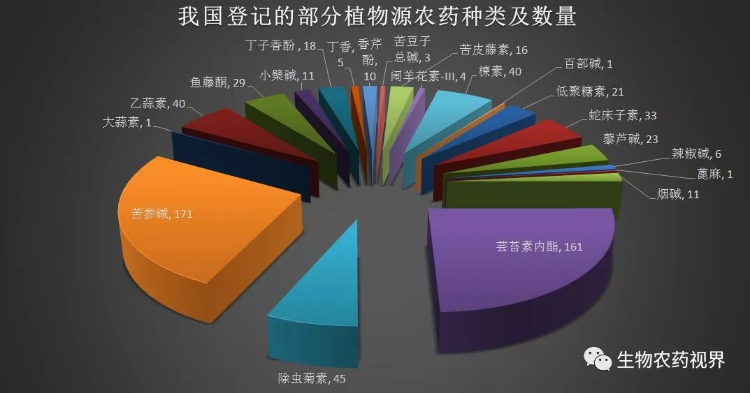 烟碱、苦参碱、小檗碱、印楝素、鱼藤酮、藜芦碱、柠檬烯、芸苔素内酯、2,4-表芸苔素内酯、樟脑、除虫菊素、蛇床子素、苦皮藤素、桉油精、八角茴香油、大黄素甲醚、狼毒素、雷公藤甲素、香芹酚、大蒜素、右旋樟脑、莪术醇、补骨脂种子提取物、银杏果提取物、博落回提取物、甾烯醇、萜烯醇等。