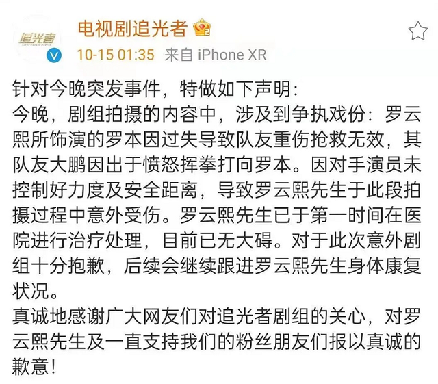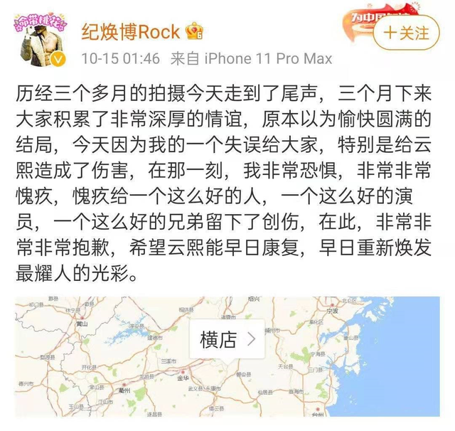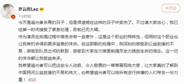 之后,纪焕博也发了微博表达歉意,称自己因为在拍摄时的一个失误,给罗云熙造成了伤害,在那一刻,他非常恐惧,非常愧疚,并表示“非常非常非常抱歉”,希望罗云熙早日康复。