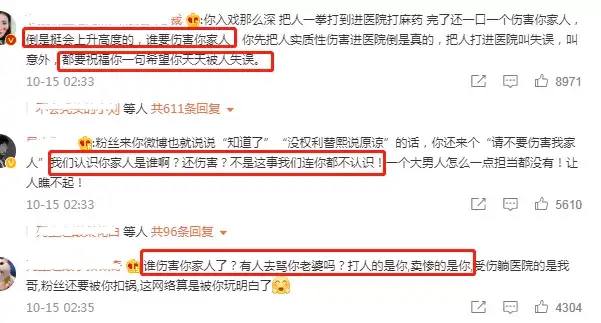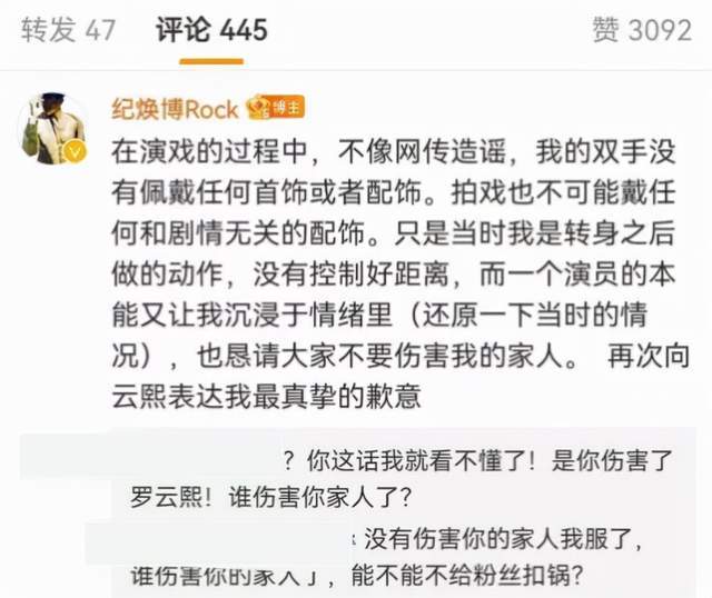 纪焕博在评论区解释自己没有戴首饰,只是因为转身之后做了这个动作,所以没有控制好距离,导致罗云熙受伤。可能是收到了很多攻击谩骂之类的话,纪焕博恳请网友“不要伤害我的家人”,结果更招致大量的“围攻”,指责他给粉丝“扣锅”。