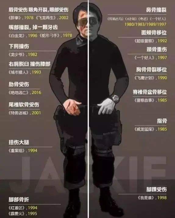 像吴京、成龙这种经常拍动作戏的,受伤几乎是家常便饭。有人曾绘制了一张成龙受伤图,通过X光线照射下的骨骼图,把成龙历年受伤状况给标注出来,真是不看不知道,一看吓一跳,各个部位几乎都有损伤。