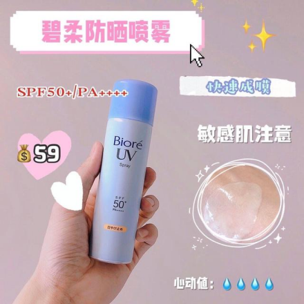 这款防晒喷雾喷出来的是水珠状,离近了喷清凉感超明显。瓶子是粉色的,颜值很可,满足芭比少女心。味道香但是不刺激。防晒值为SPF50+PA+++,日常用够了,就是它的防水防汗表现比起其他几支喷雾要稍微差一点。