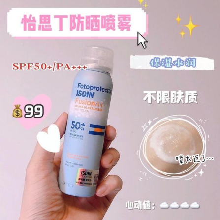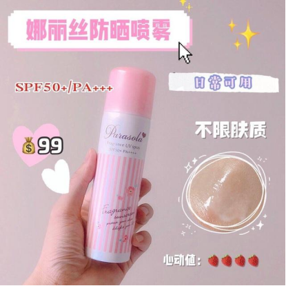 喷雾是透明的,能很快成膜,肤感清凉。刚喷出来有酒精味道,成膜后会消失,防晒力可以,小小一支,方便携带。只是敏感肌需慎选。总体来说,没有大毛病,价格实惠,预算不多肤质健康的姐妹盘它就行。