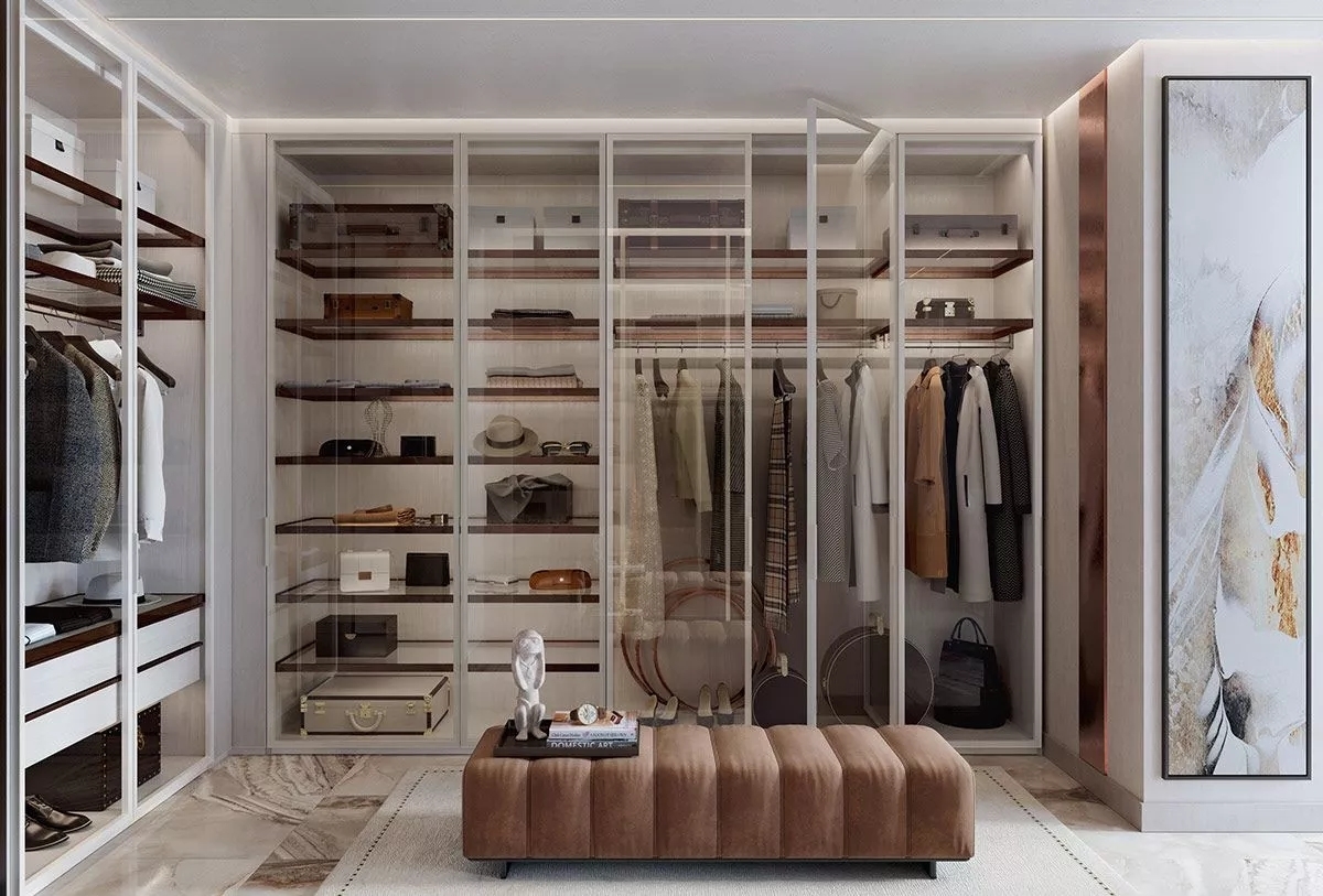 很多轻奢高级的衣帽间设计大多都用过玻璃柜门,搭配上灯光作用,显得很高级。但实际情况却是案例中的衣柜里的衣服都是经过搭配的,所以看起来很高大上,但是我们家里的衣服都是怎么方便怎么放,不会特别讲究。如果选择了玻璃柜门,只会放大衣柜的凌乱。