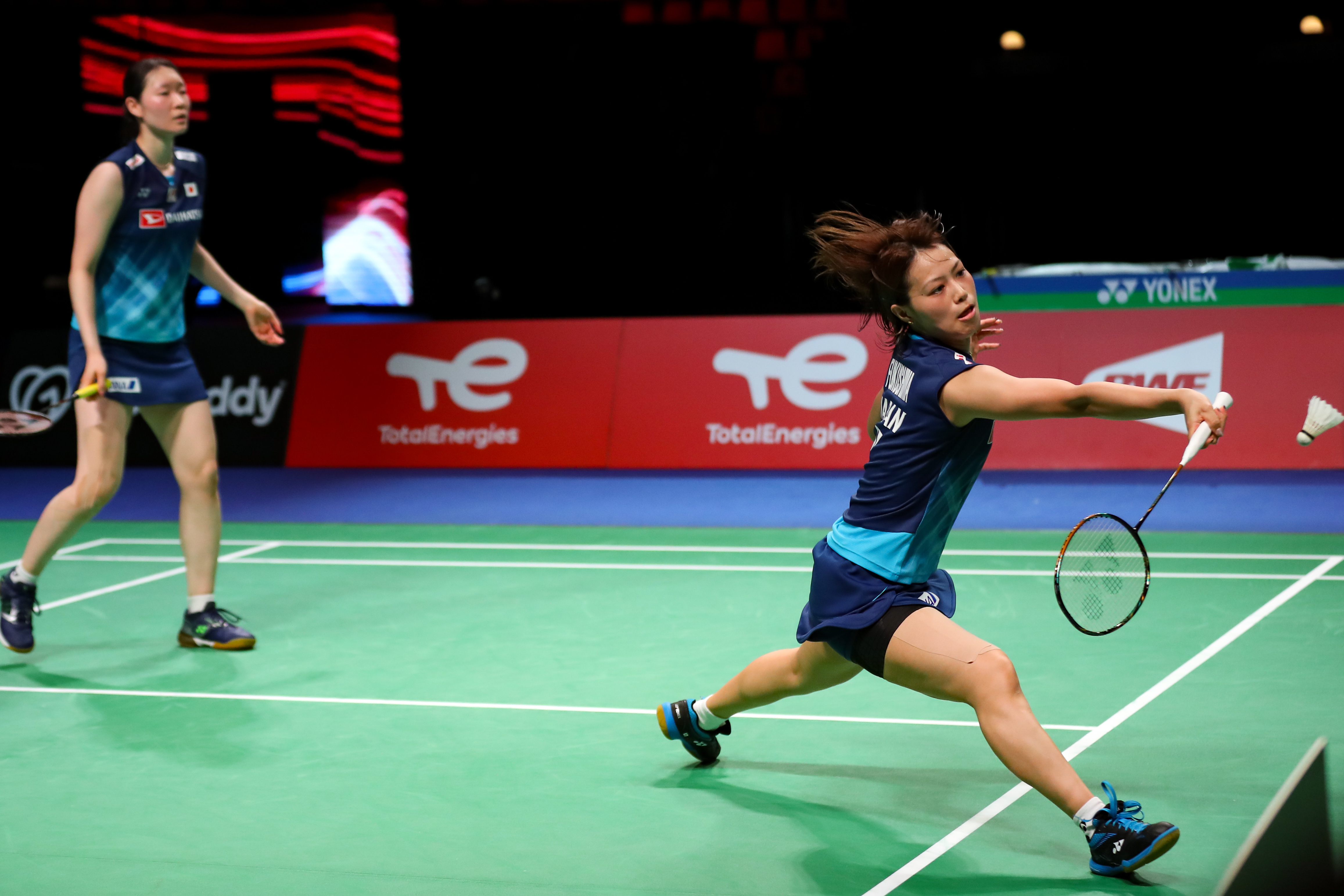 10月15日,日本队组合福岛由纪(右)/松本麻佑在女双比赛中。她们以2比1战胜韩国队组合李绍希/申昇瓒。新华社记者张铖摄