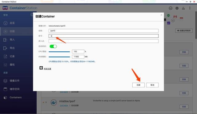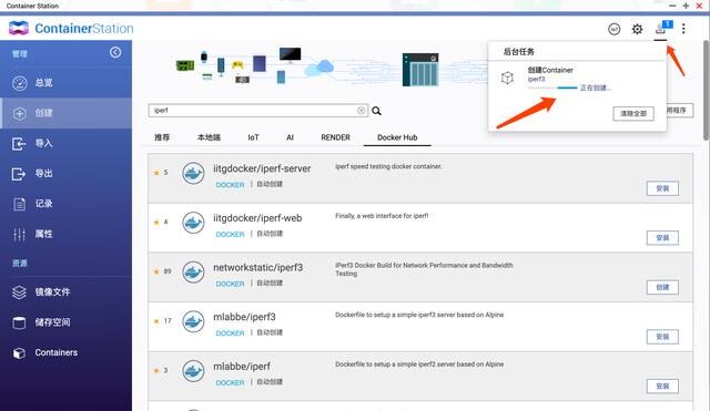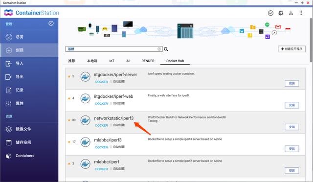 NAS 一般是威联通和群晖,X86 的都支持 docker,所以在 docker 里搜索 iperf 找到镜像,我默认选择推荐星星最多的 networkstatic/iperf3,这里以威联通为例,群晖同理。