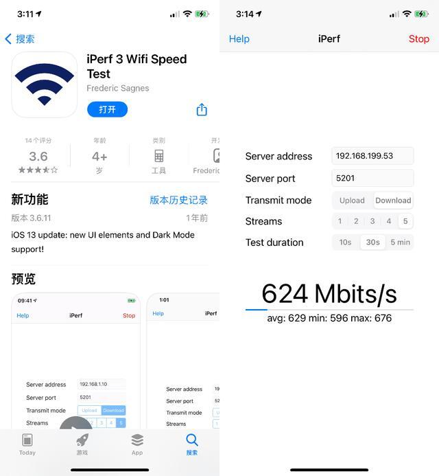 苹果手机安装 iperf3 也特别简单,直接在国区的 App Store 里就能找到,打开后只需要输入想要测试的服务器 IP 地址,端口号(默认是 5201,如果手动指定需要修改),upload 和 download 分别是测试手机上传至服务器和从服务器下载的方式,还可以指定几路数据访问以及测试时长,选好后就点击右上角的 start 按钮,下方的数据非常直观,会有最高值、最低值和平均值。