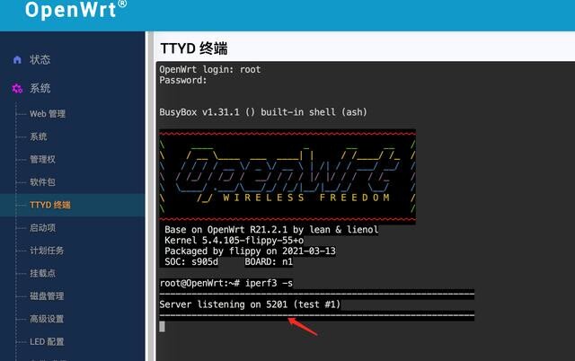 打开监听端口,此时 N1 旁路由既可以作为服务器也可以作为客户端来测试局域网内其他设备的连接速度。