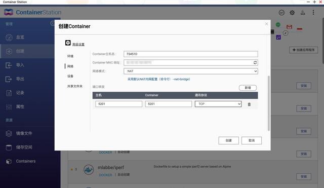 网络环境新增一个 TCP 端口,主机和容器都选择 5201,一般 iperf3 默认的端口也是 5201。