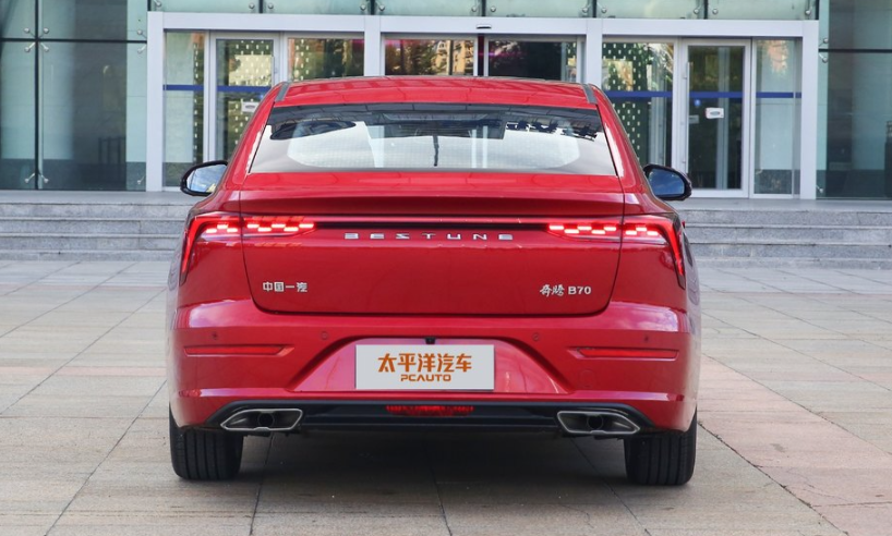 尾部看,奔腾B70的尾灯前后呼应,“戈”造型,贯穿式,而且加之“宫殿”车尾,“宫檐”尾翼以及“战矛”排气,中国文化风意味十足。