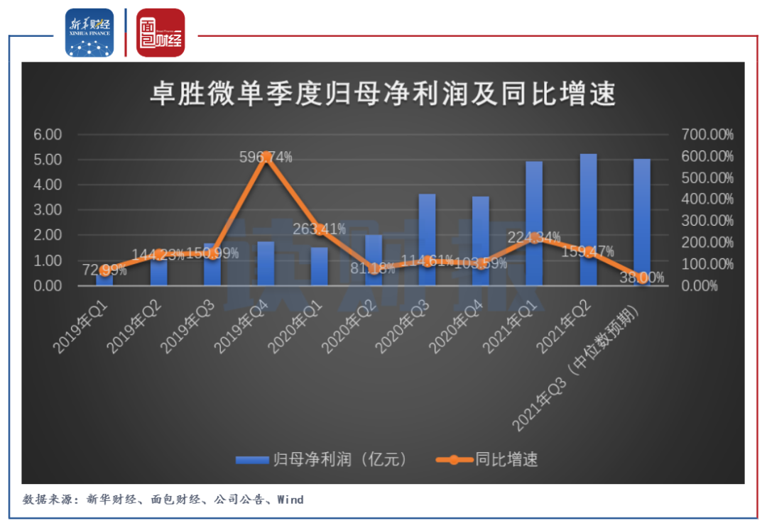 图2:2019年Q1至2021年Q3(中位数预期)卓胜微归母净利润及同比增速
