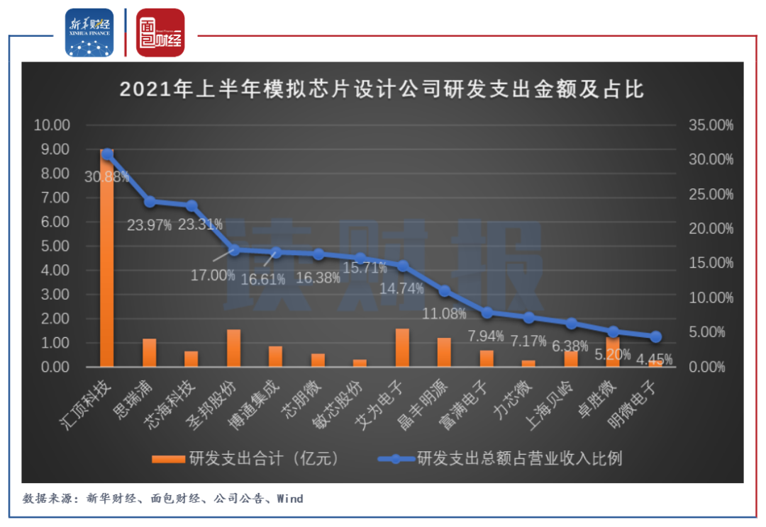 图6:2021年上半年模拟芯片设计公司研发支出金额及占比