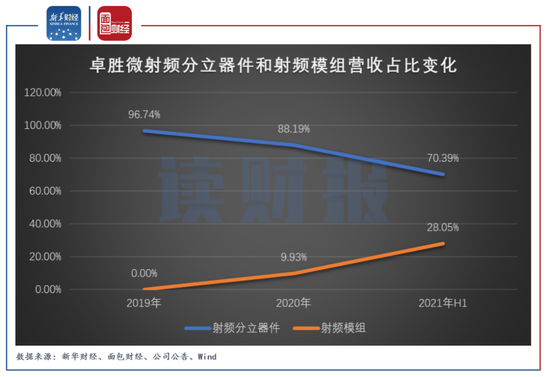 2019年刚上市时,卓胜微的产品全部来自于射频分立器件,营收占比达到96.74%,主要包括射频开关、低噪声放大器这两大产品;2020年,公司射频模组产品开始产生销售,营收占比达到9.93%;到了2021年上半年,公司射频模组产品的营收占比进一步上升至28.05%。