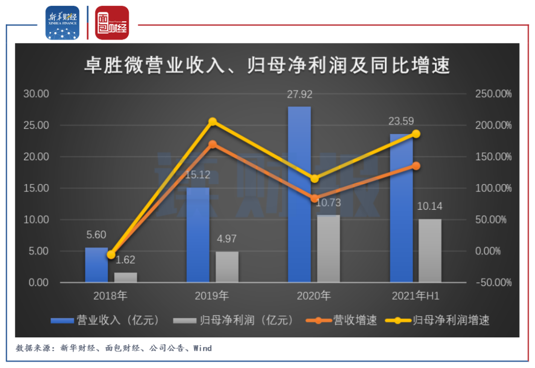 图1:2016年至2021年H1卓胜微营业收入、归母净利润及同比增速