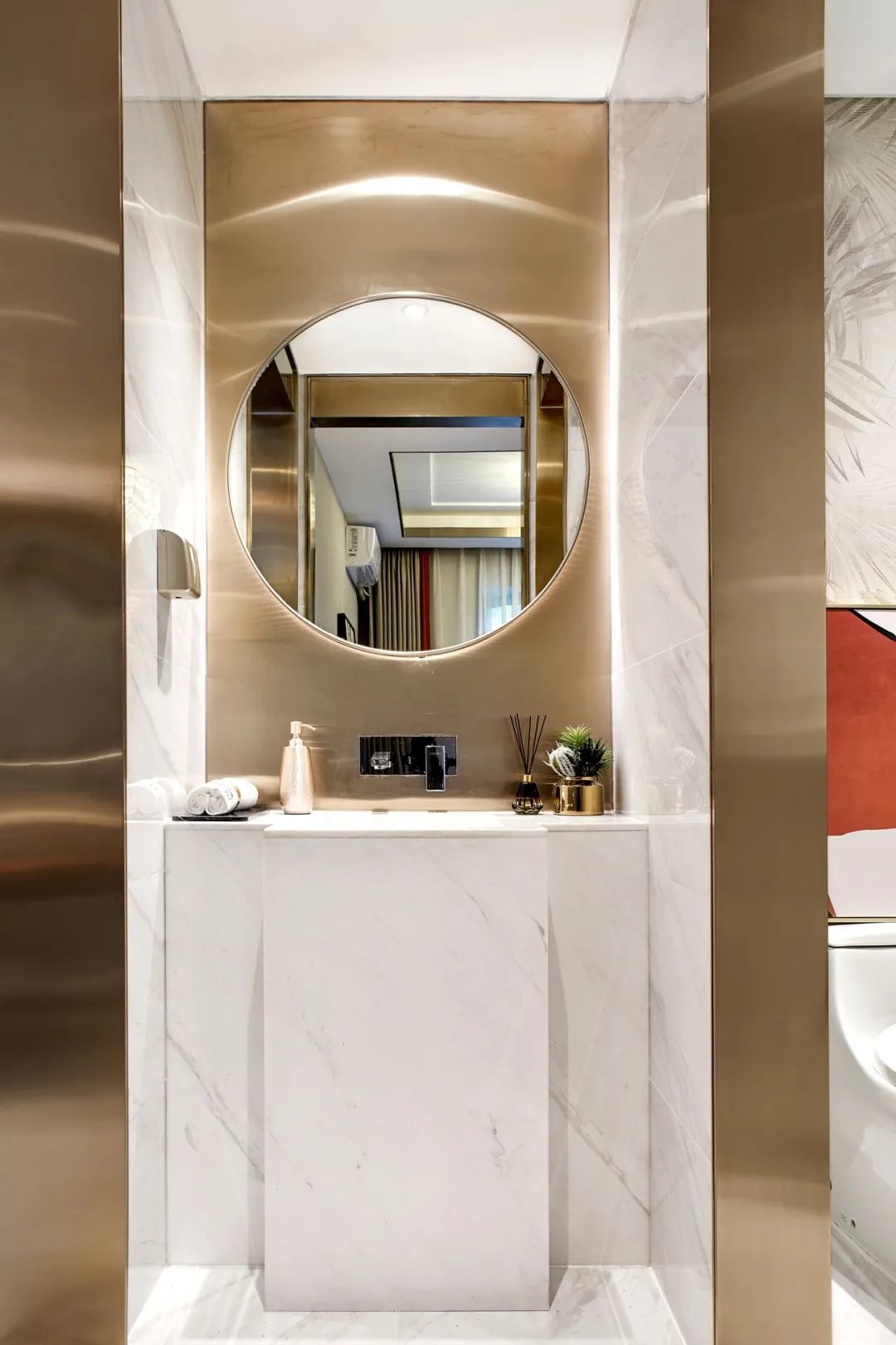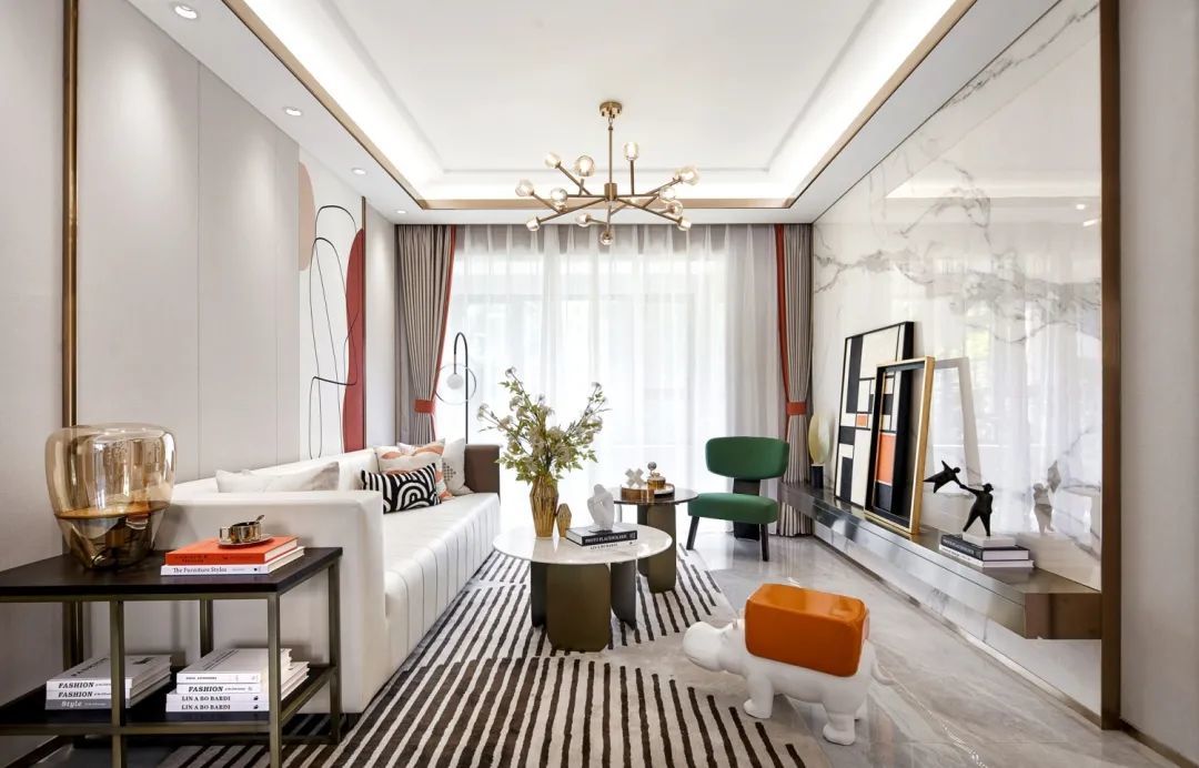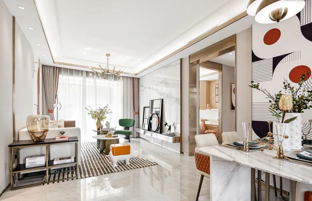 在这套130平米的房子中,整体空间以现代风的空间,加入大理石与金属质感,搭配上橙色的软装,布置精致的小饰品,营造出一种华丽高档的轻奢风格格调。