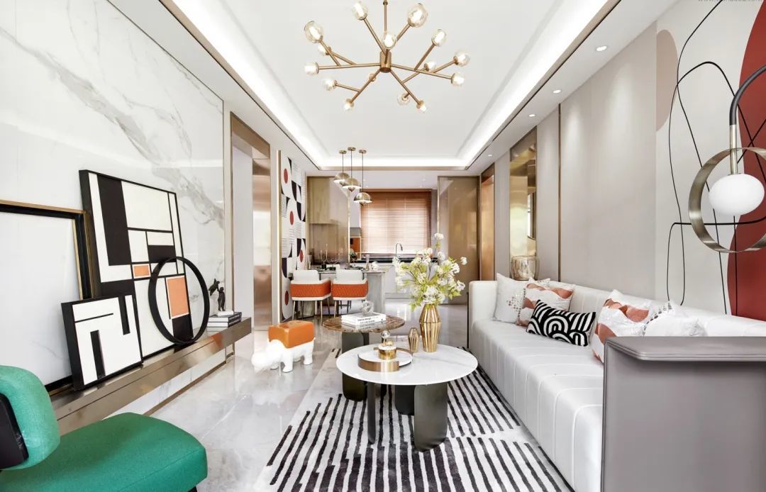 ▲墨绿色沙发椅、橙+白色可爱造型的鼓凳,岩板茶几上布置金属花瓶,天花上再装一盏金属质感的吊灯,为我们呈现出一种华贵的空间氛围。