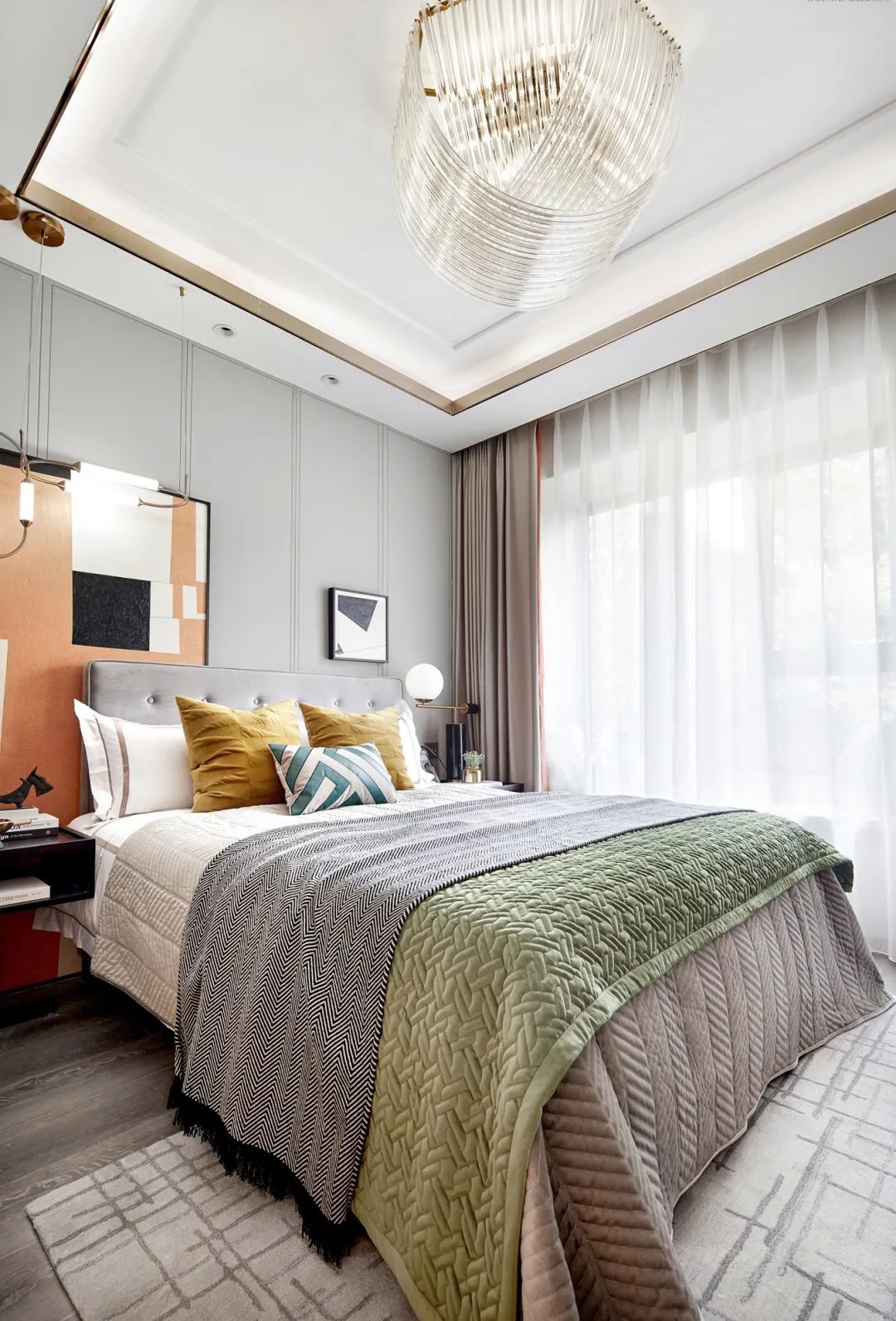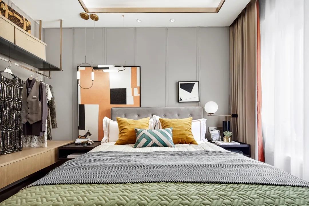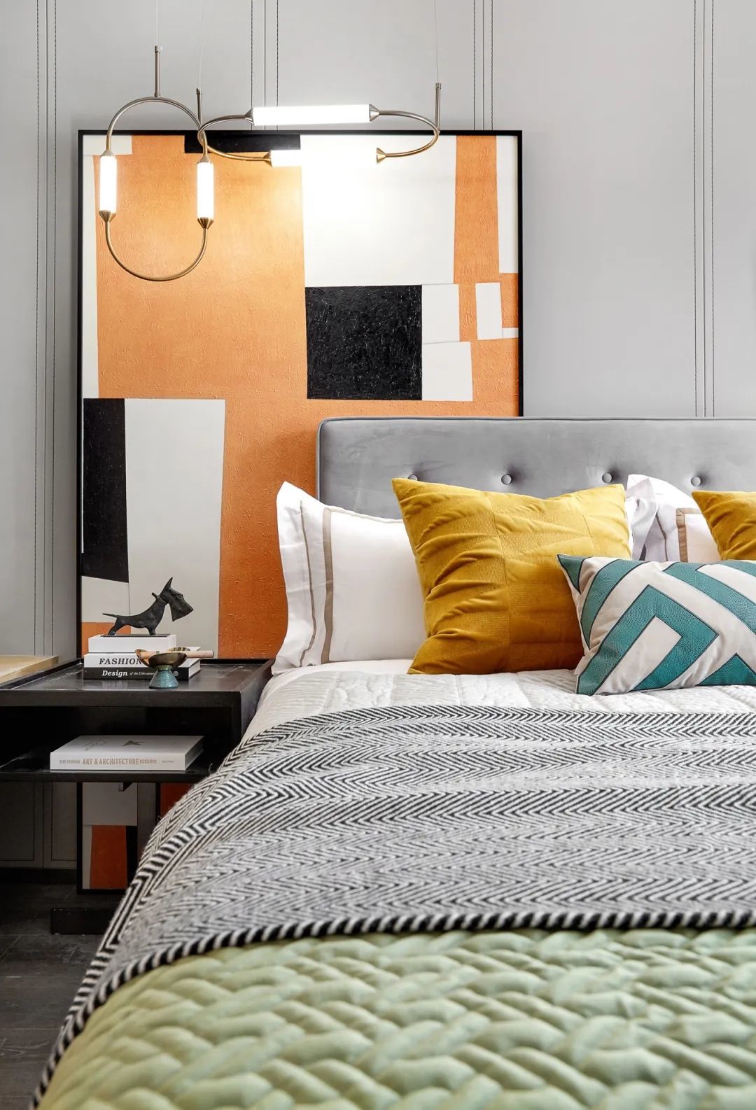 ▲灰色与绿色的床单,白色与黄色的枕头,在橙色床头装饰画的背景下,呈现出一种素雅的端庄感,使得整个卧室都充满活泼与舒适的氛围。