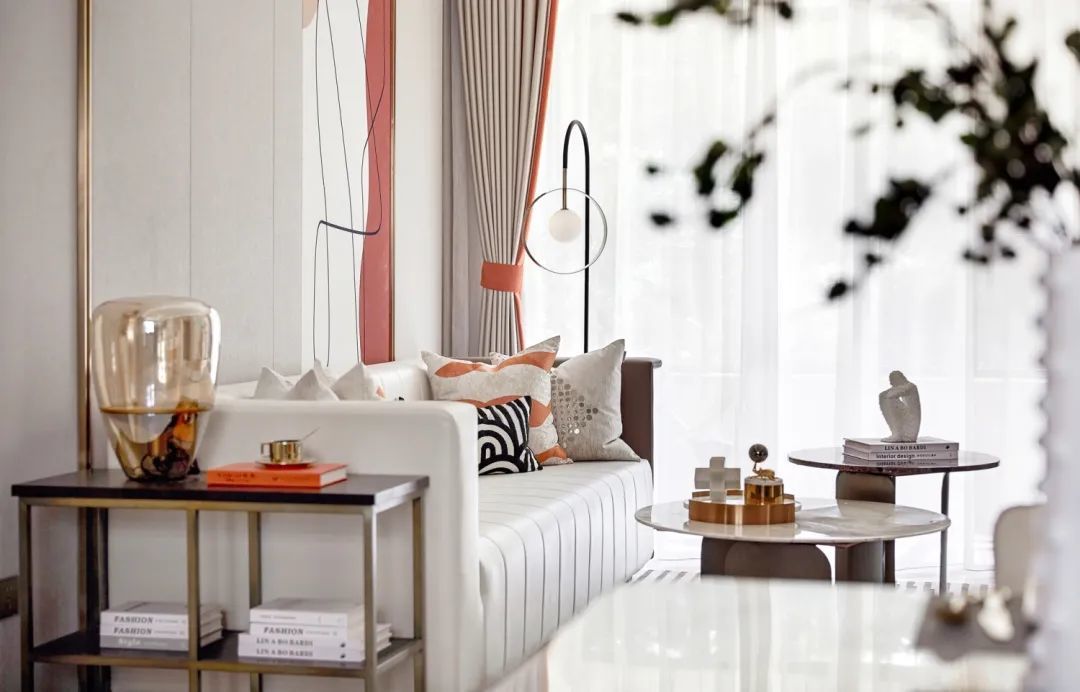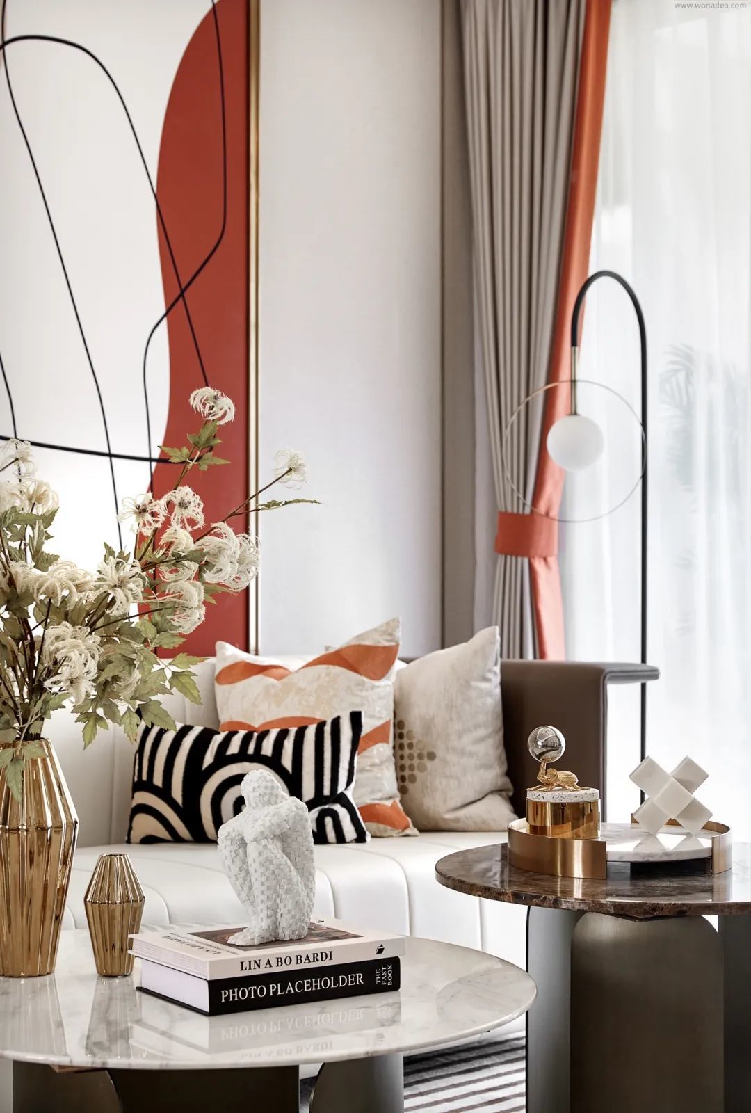 ▲窗帘、抱枕与细节软装上,加入跳跃的橙色,布置在现代端庄的空间下,也使得空间充满活力感。