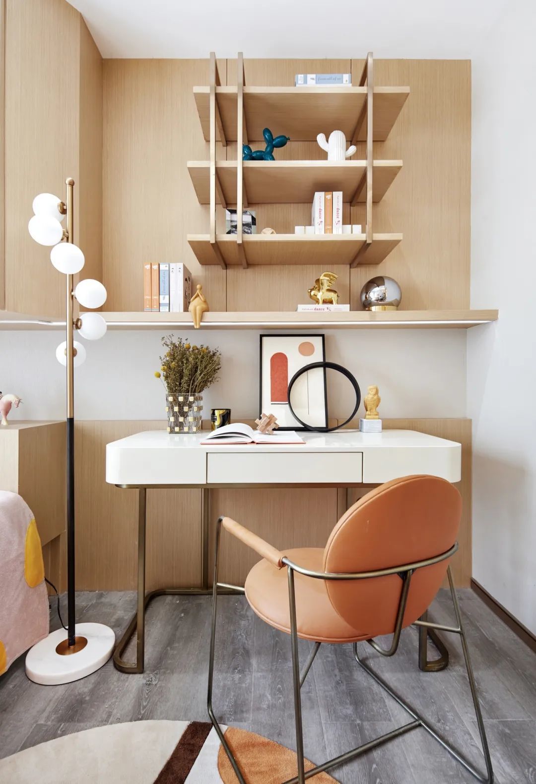 ▲墙面以木饰面为背板,装上吊架书架,布置一张金属脚架的白色书桌,布置金属摆饰品、书籍与花瓶,摆上橙色的金属架椅子,也让空间显得更加自然而活泼精致。