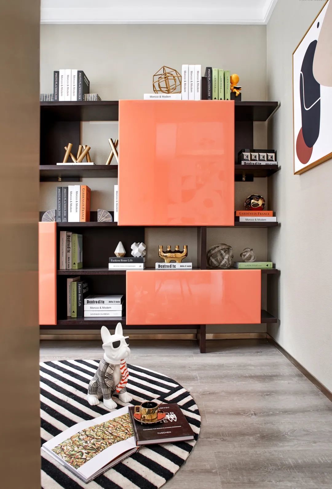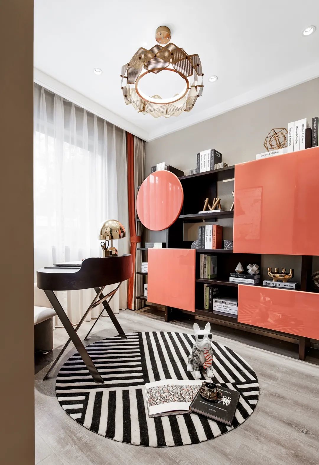 ▲在地面布置圆形的斑马图案地毯,摆上一张简雅的书桌椅,侧边橘红色的书柜,色彩搭配活力、造型也是优雅高级,布置书籍与金属摆饰品,显得端庄而华丽。