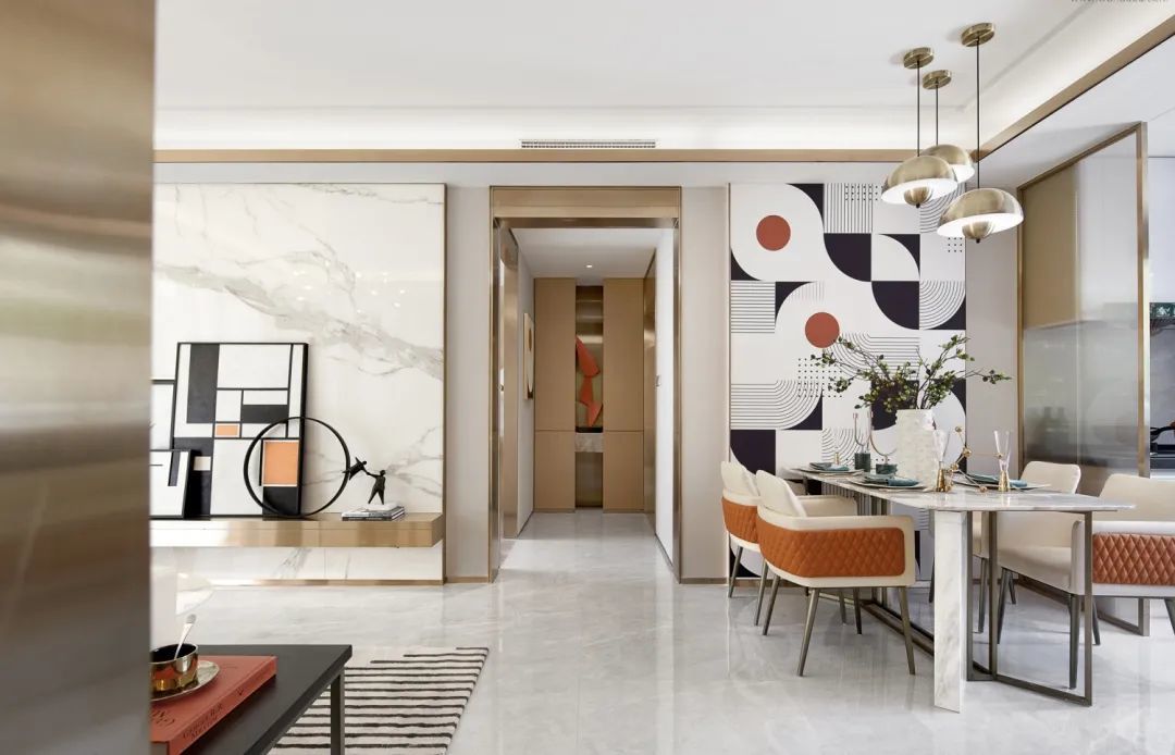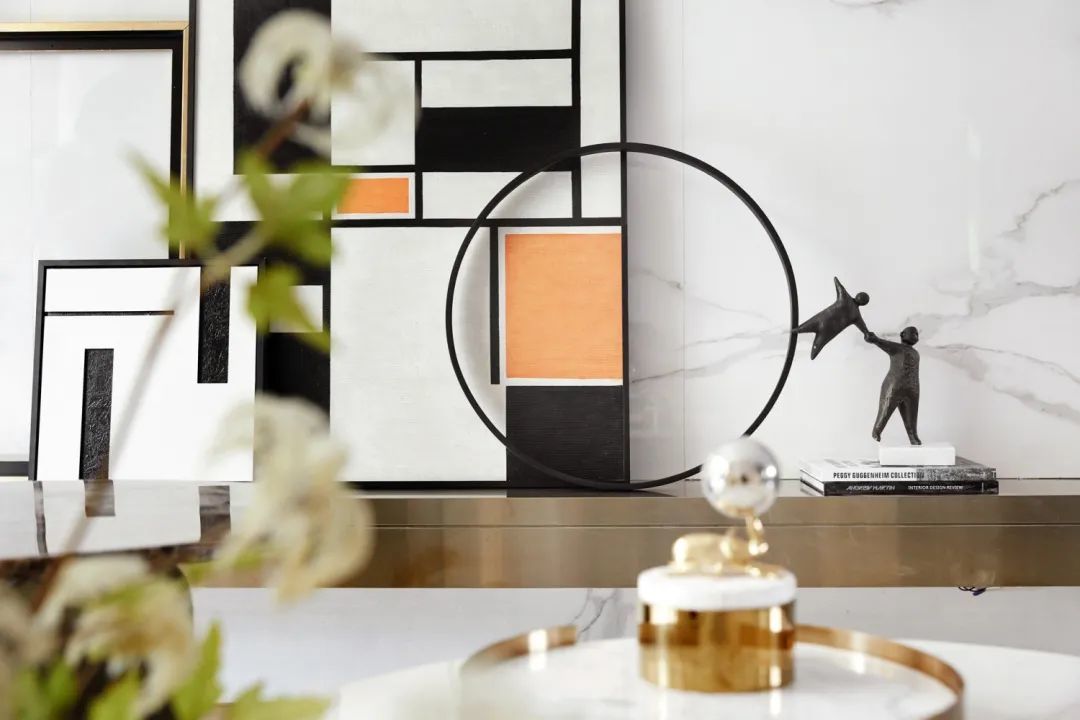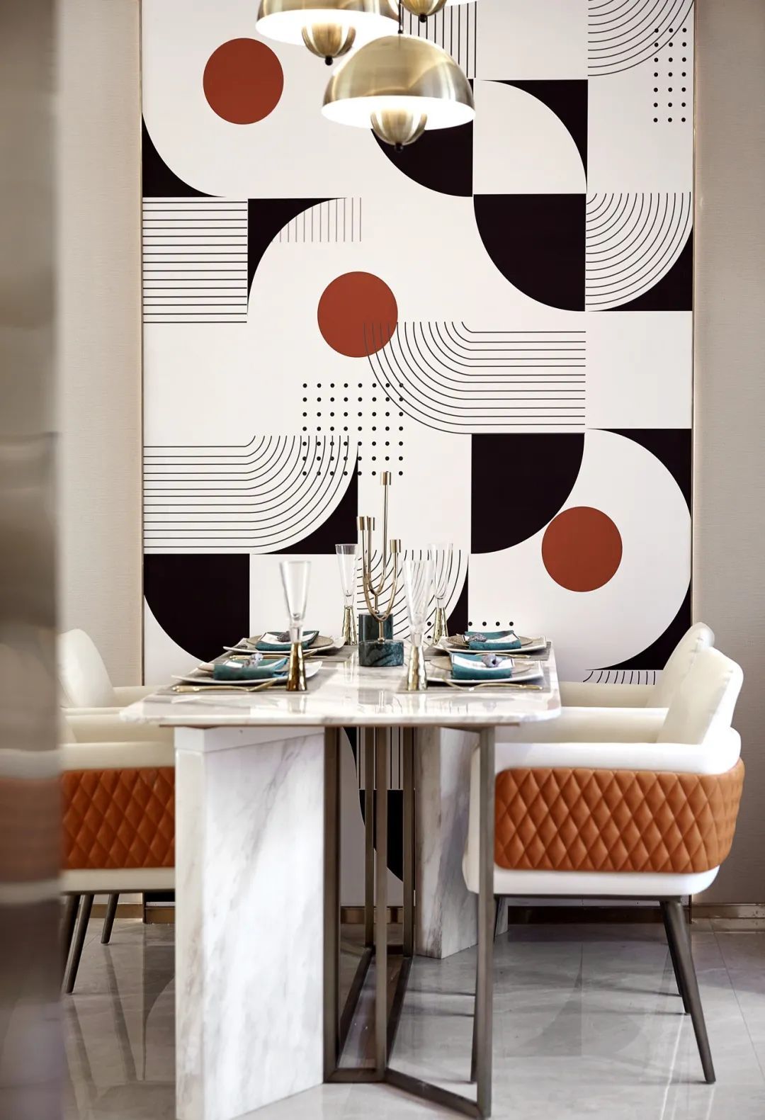 ▲餐厅背景墙是一幅大尺寸的抽象几何艺术挂画,以黑白橙色的搭配为主,布置大理石+金属质感结合的餐桌,搭配橙白配的皮艺餐椅,让空间显得更加端庄高级而精致。
