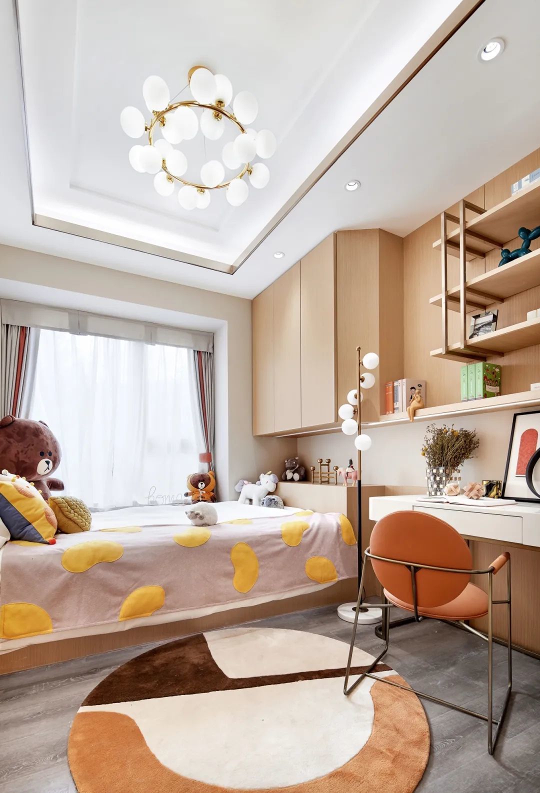 ▲儿童房空间相对紧凑,把床飘窗定制,后方吊柜与书桌连贯一体设计,布置粉色带黄色点块图案的床单,还有可爱的公仔布置,地面铺上一块圆形的杂色地毯,带来一种实用而童趣的空间。