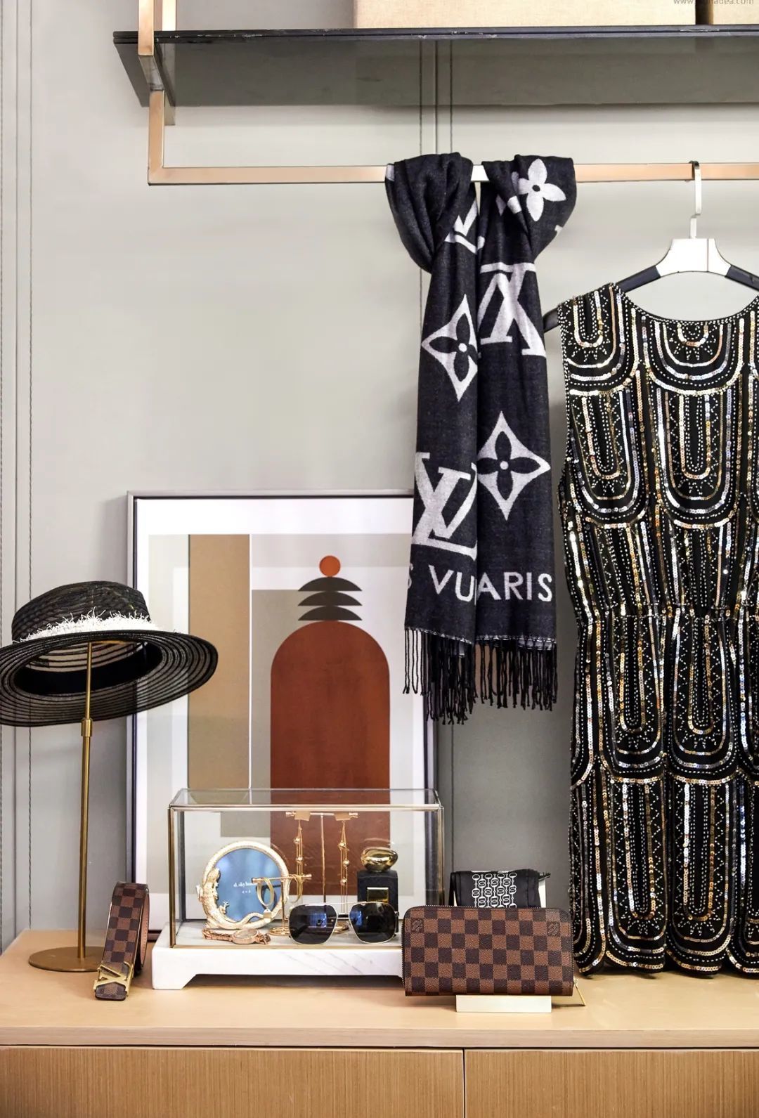 ▲开放式挂衣架上,摆上首饰品、包包与帽子,也增添了卧室空间的优雅与情趣。