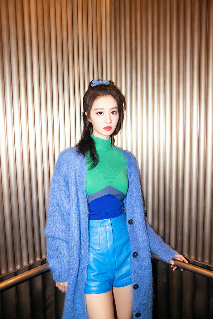 王楚然蓝绿大胆配色显优越好身材 扎高马尾眉眼灵动少女感十足