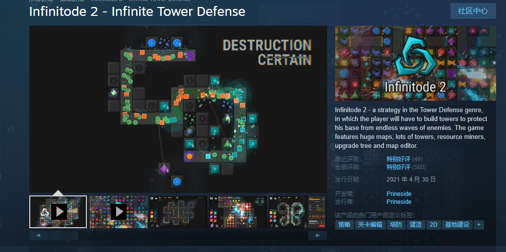 《无限塔防 2》目前在 Steam 好评率为 87%,游戏支持简体中文。