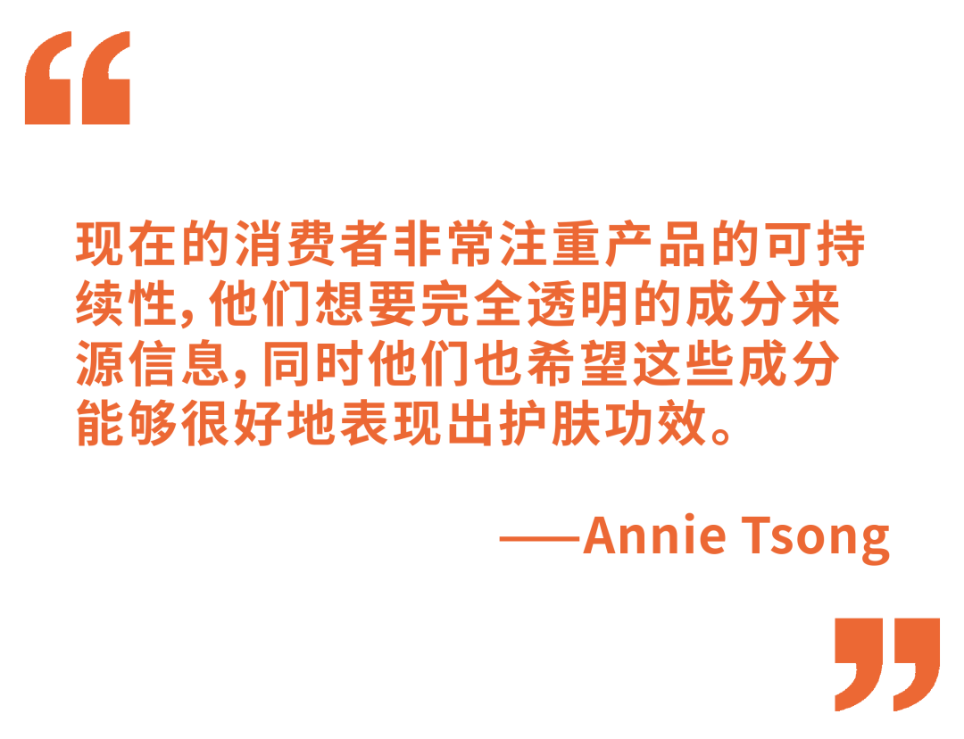 Annie Tsong 认为大型美容护肤集团在这股趋势下会面临着更大的压力,因为它们要开始真正地提高其产品的环保性了,而不是像以往那样喊喊口号就可以了,现在的消费者已经变得不那么好骗了。“因此,许多公司正试图弄清楚未来它们将如何获得生物基成分,这些成分来自可再生碳,而不是石油基——这是一个最主要的优先事项。”