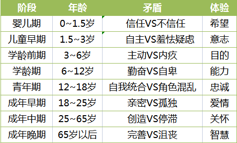 上表简单概括了埃里克森人格发展八阶段理论中每个阶段所对应的年龄、面临的矛盾和体验。